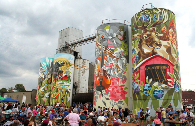 Indiana’s largest mural can be found in Putnam County across four concrete silos in Greencastle. The silo mural is part of the Putnam County Mural Project, which has produced 17 murals throughout the county and hosted two mural festivals. The silos initially stored grain for a nearby feed store, but Greencastle repurposed them after receiving Indiana’s first multi-million-dollar Stellar Communities Grant in 2011. More than 2,000 residents voted on its final design featuring symbols that represent the county’s veterans, agricultural roots, music festivals, and nature preserves.