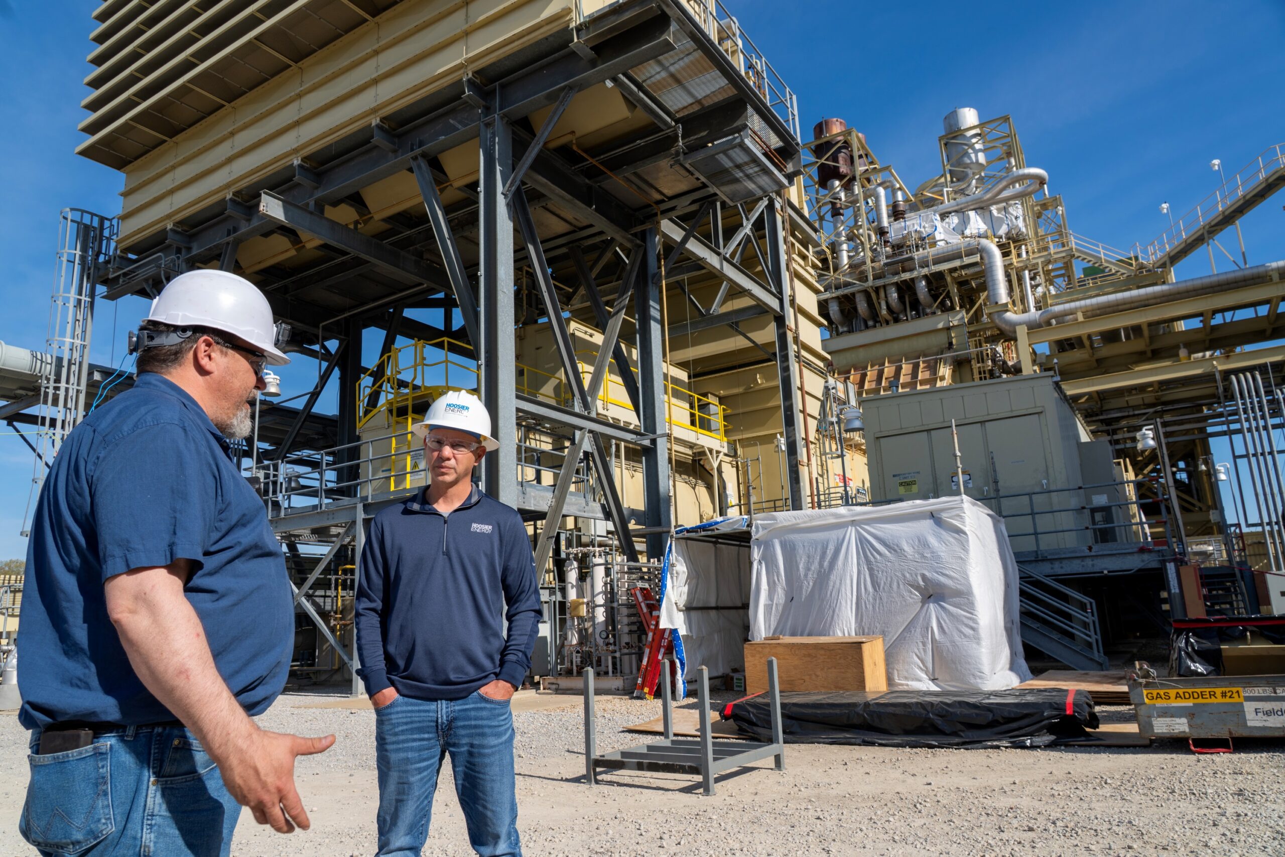 Plant Manager Kent Schmohe and Hoosier Energy Director of Generation Strategy Cory Samm on site at Holland Energy Plant