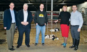 From left: Mark Batman, CEO of Marshall County REMC; Jay Bartlett, president and CEO of Wabash Valley Power Association; Brian Houin, Homestead Dairy; Lt. Gov. Suzanne Crouch; and Brook Steed, senior regional economic development representative at Wabash Valley Power, pose for a photo at Homestead Dairy.