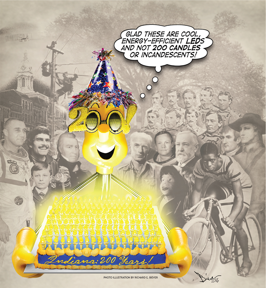 Electric co-op mascot Willie Wiredhand says Indiana’s 200 years of history and its future are sooooo bright, he has to wear shades … or “bicentennial bifocals,” as he calls them!
