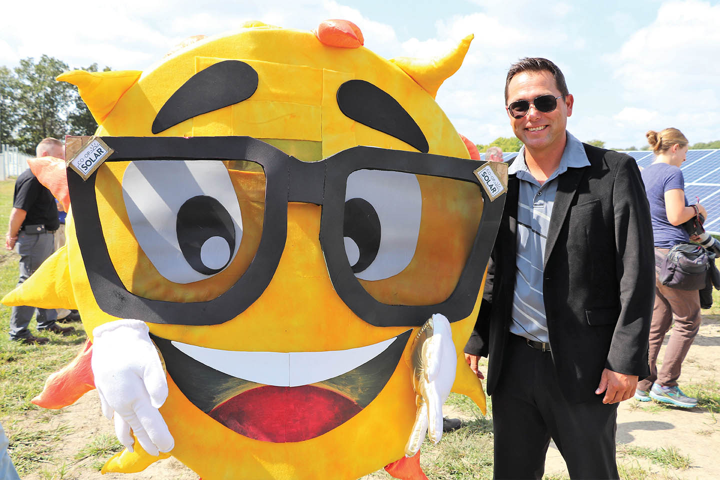 Rob Schwartz, CEO of Miami-Cass REMC, poses with Co-op Solar mascot Ray during the solar array dedication in Peru, Indiana. The site is one of three new arrays, and five overall, generating 1.7 megawatts of electricity for the Co-op Solar program.