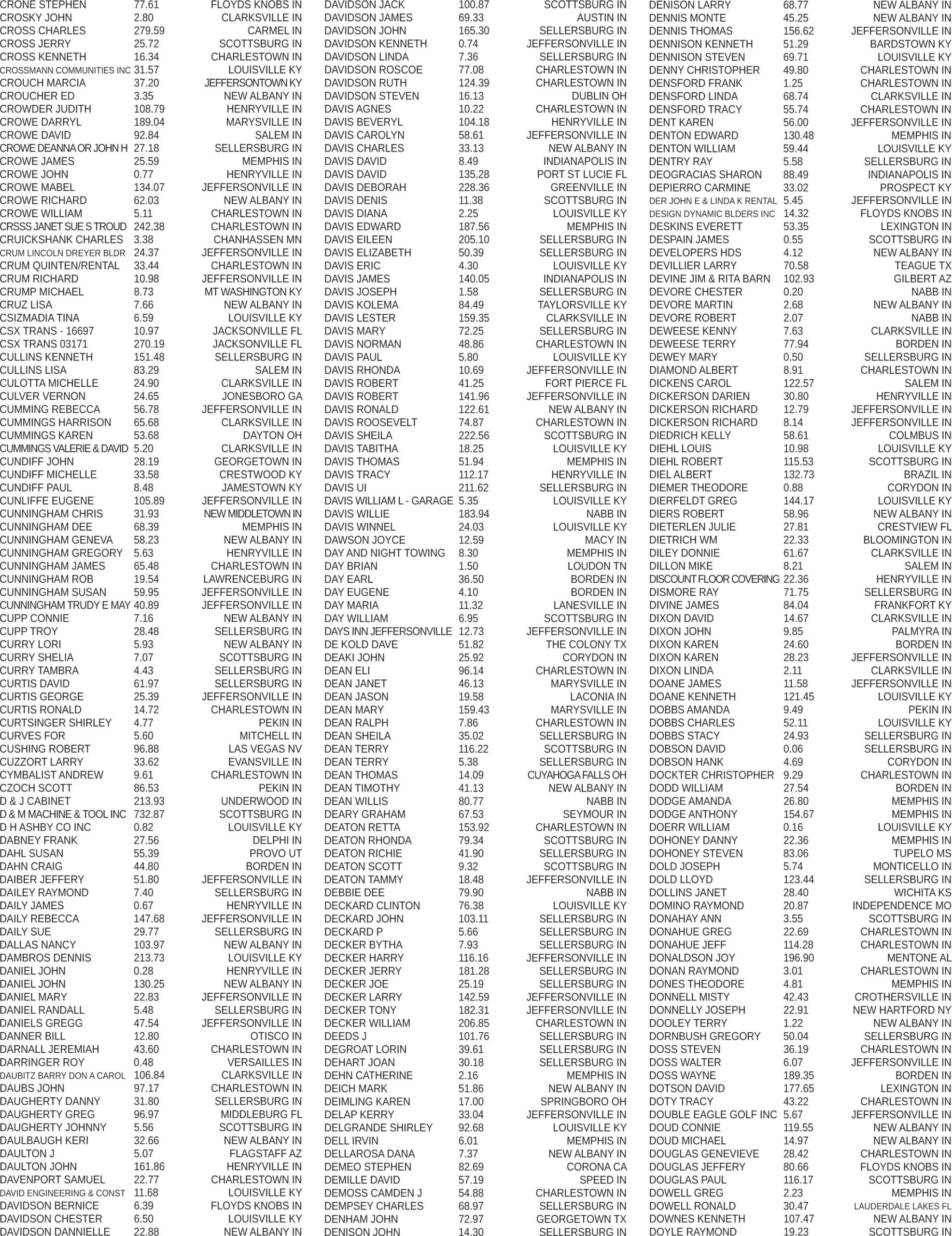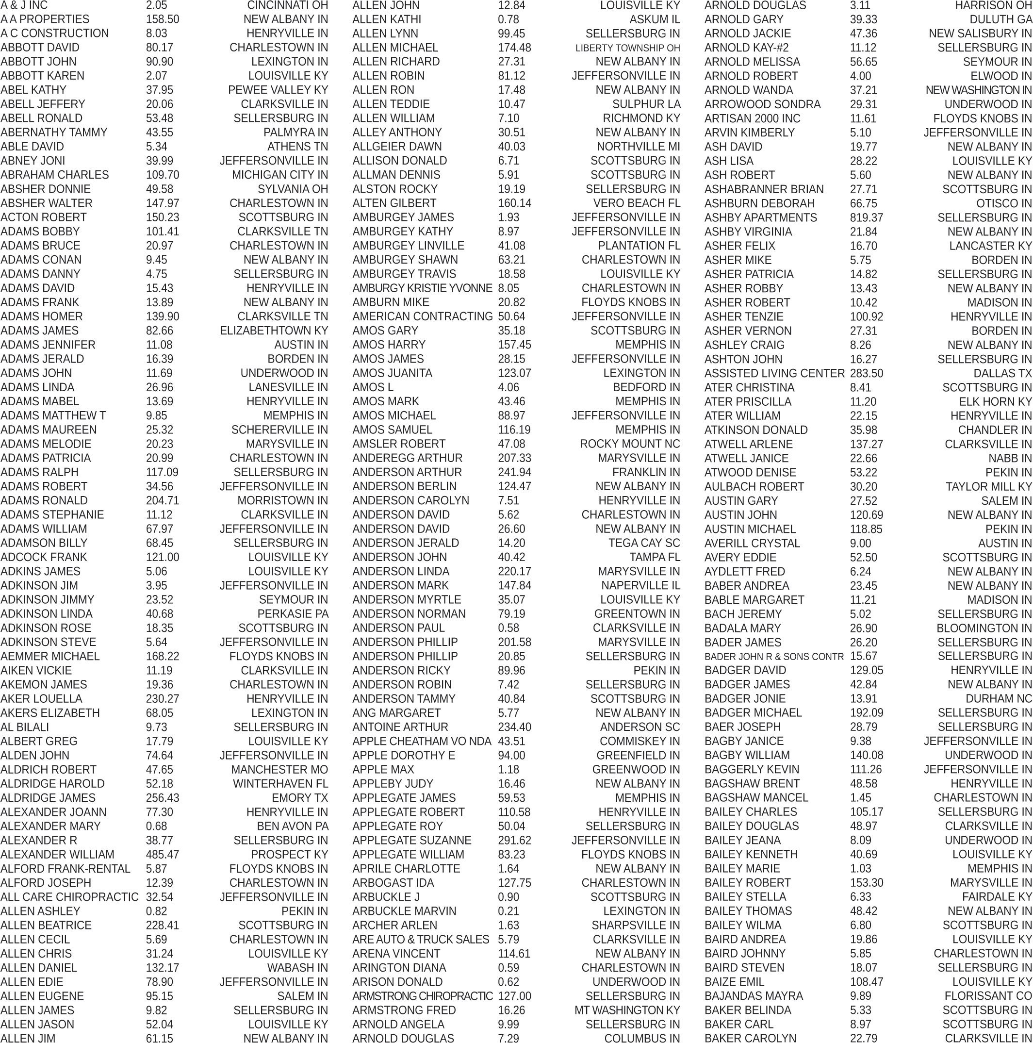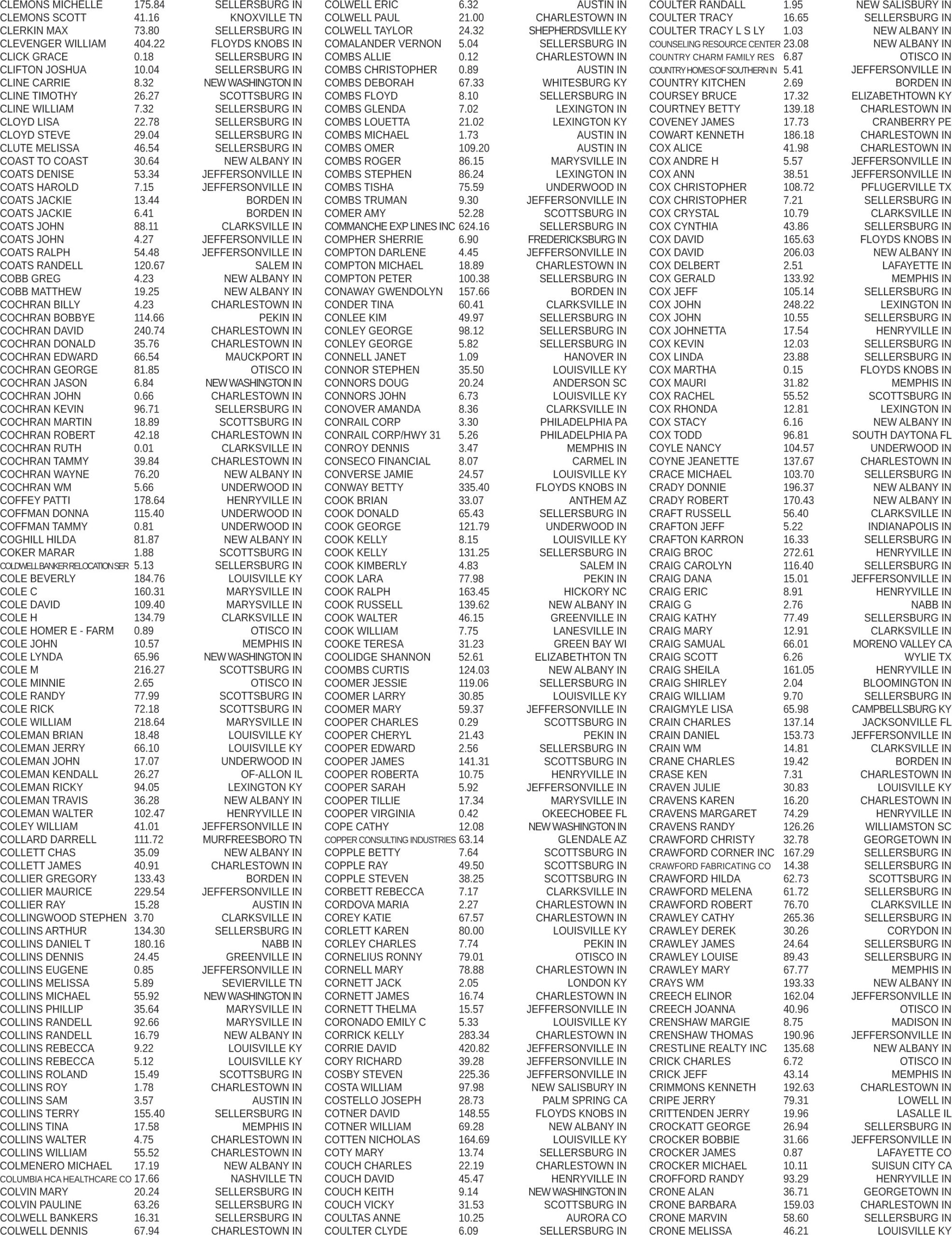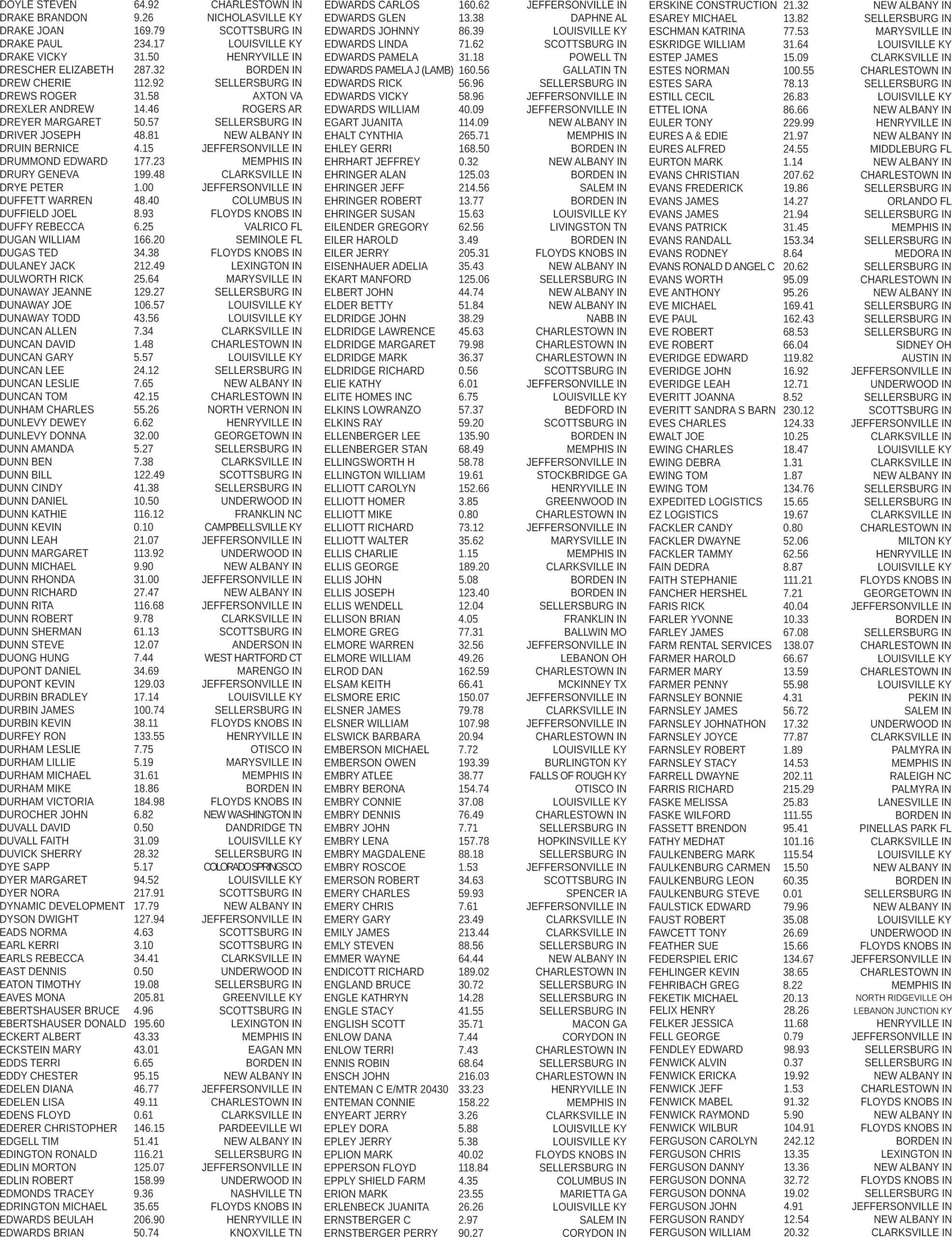 The following listing represents account balance and capital credit refund checks issued to current or former members of REMC which remain unclaimed at the current time. This listing includes the name, last known city and state of residence, and amount due to the member. If you are entitled to claim any of the following amounts, please call us at 812-246-3316. You must provide proper identification and a current mailing address so that we can issue a replacement check. Any amounts not claimed by the rightful recipients within 60 days of first being published will be reallocated among the current REMC membership. Please contact our office at 812-246-3316 if you have any questions.