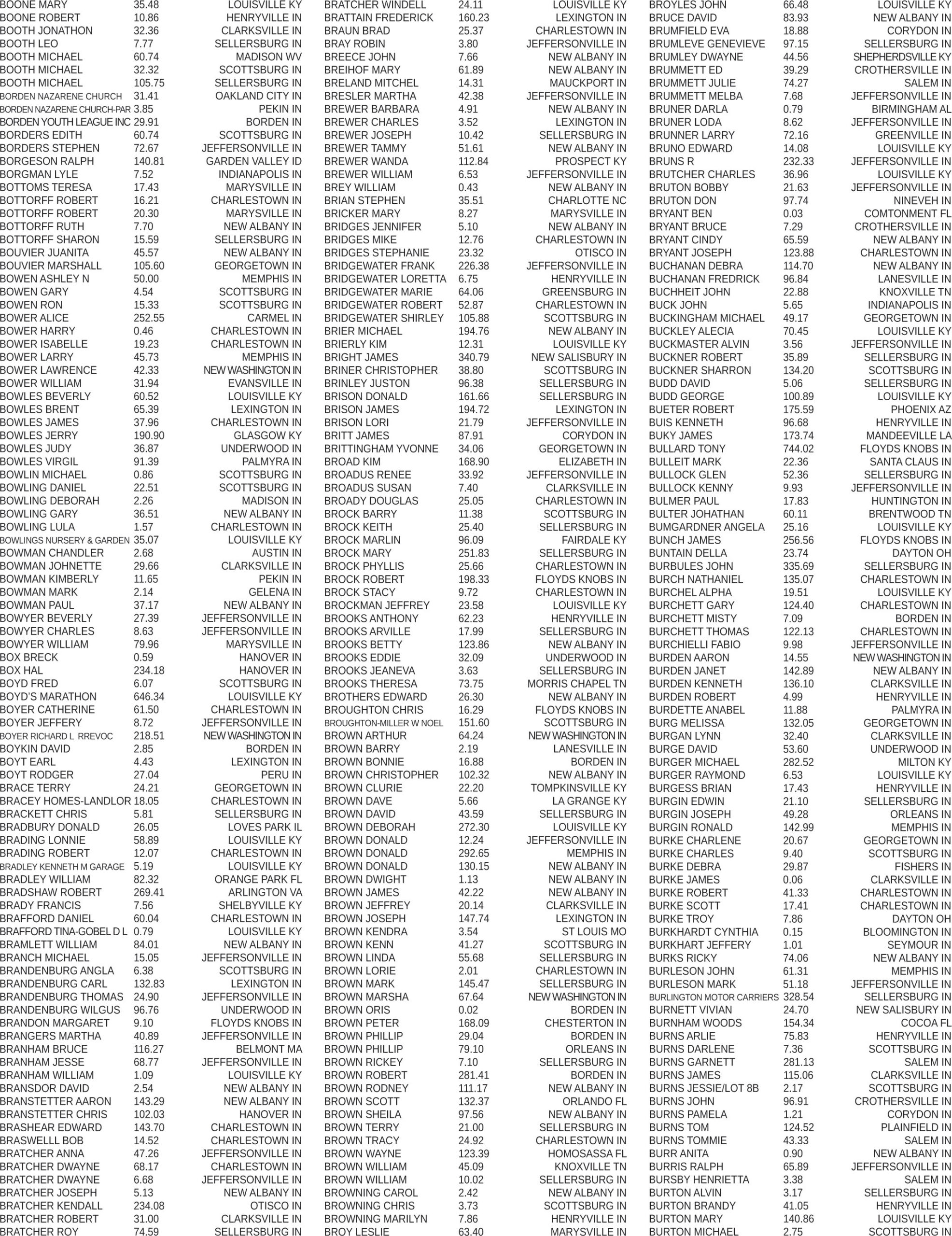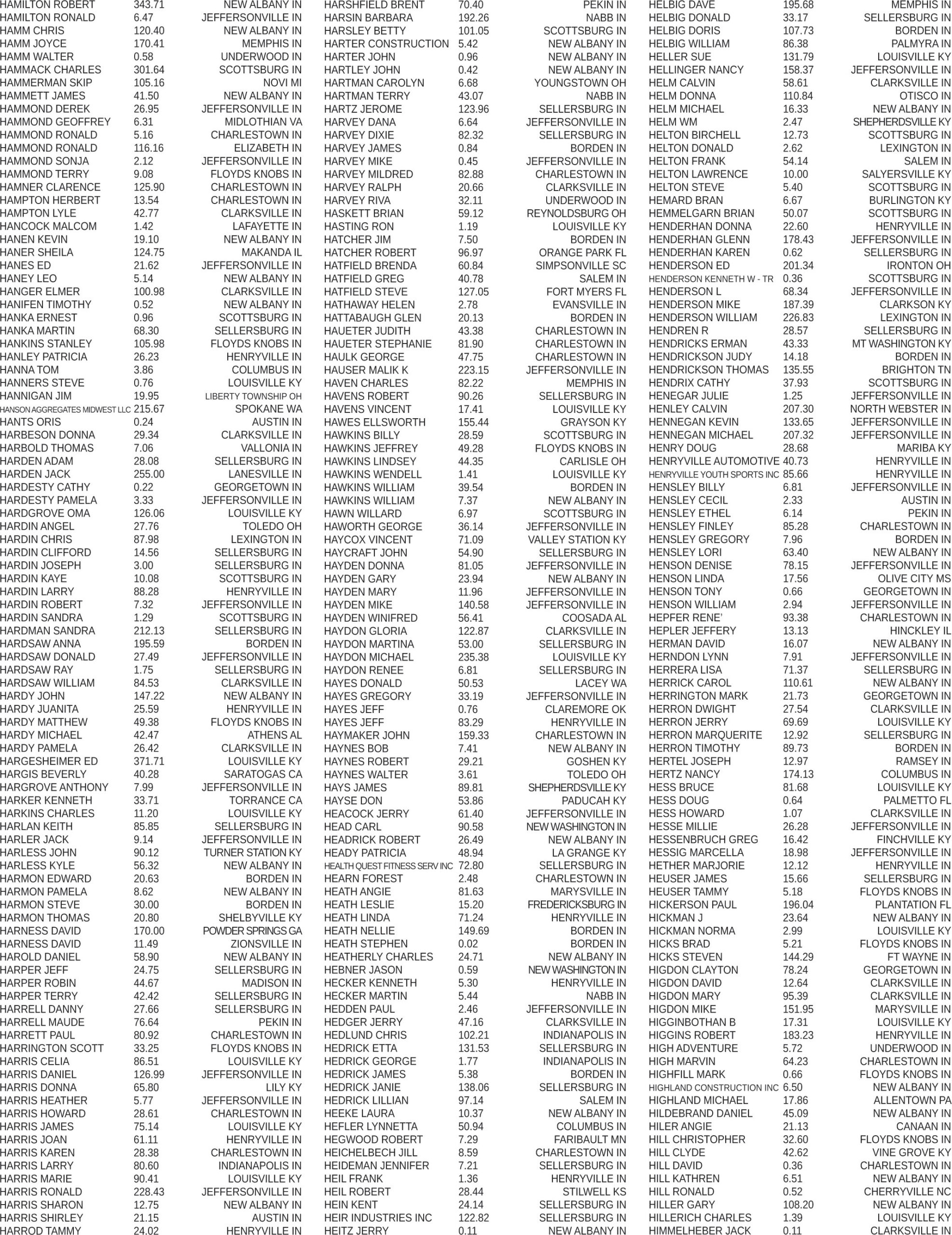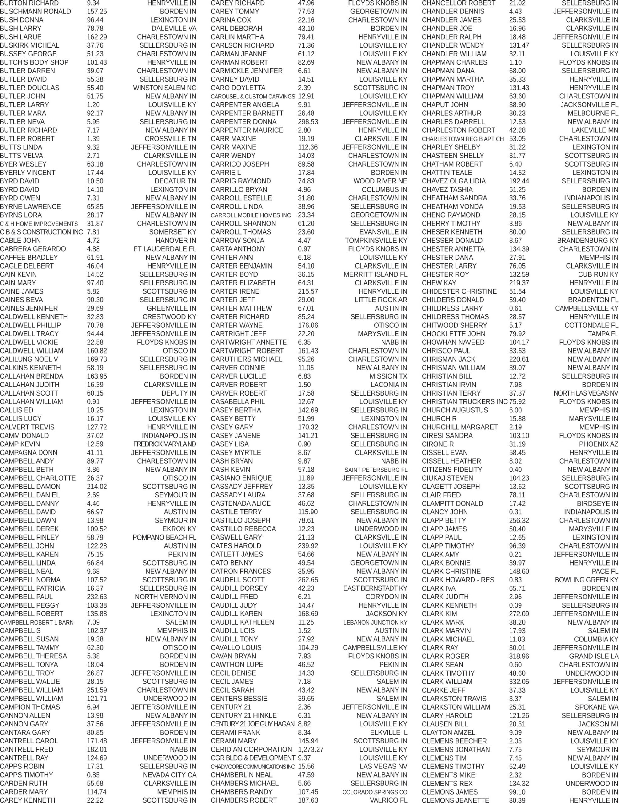 The following listing represents account balance and capital credit refund checks issued to current or former members of REMC which remain unclaimed at the current time. This listing includes the name, last known city and state of residence, and amount due to the member. If you are entitled to claim any of the following amounts, please call us at 812-246-3316. You must provide proper identification and a current mailing address so that we can issue a replacement check. Any amounts not claimed by the rightful recipients within 60 days of first being published will be reallocated among the current REMC membership. Please contact our office at 812-246-3316 if you have any questions.