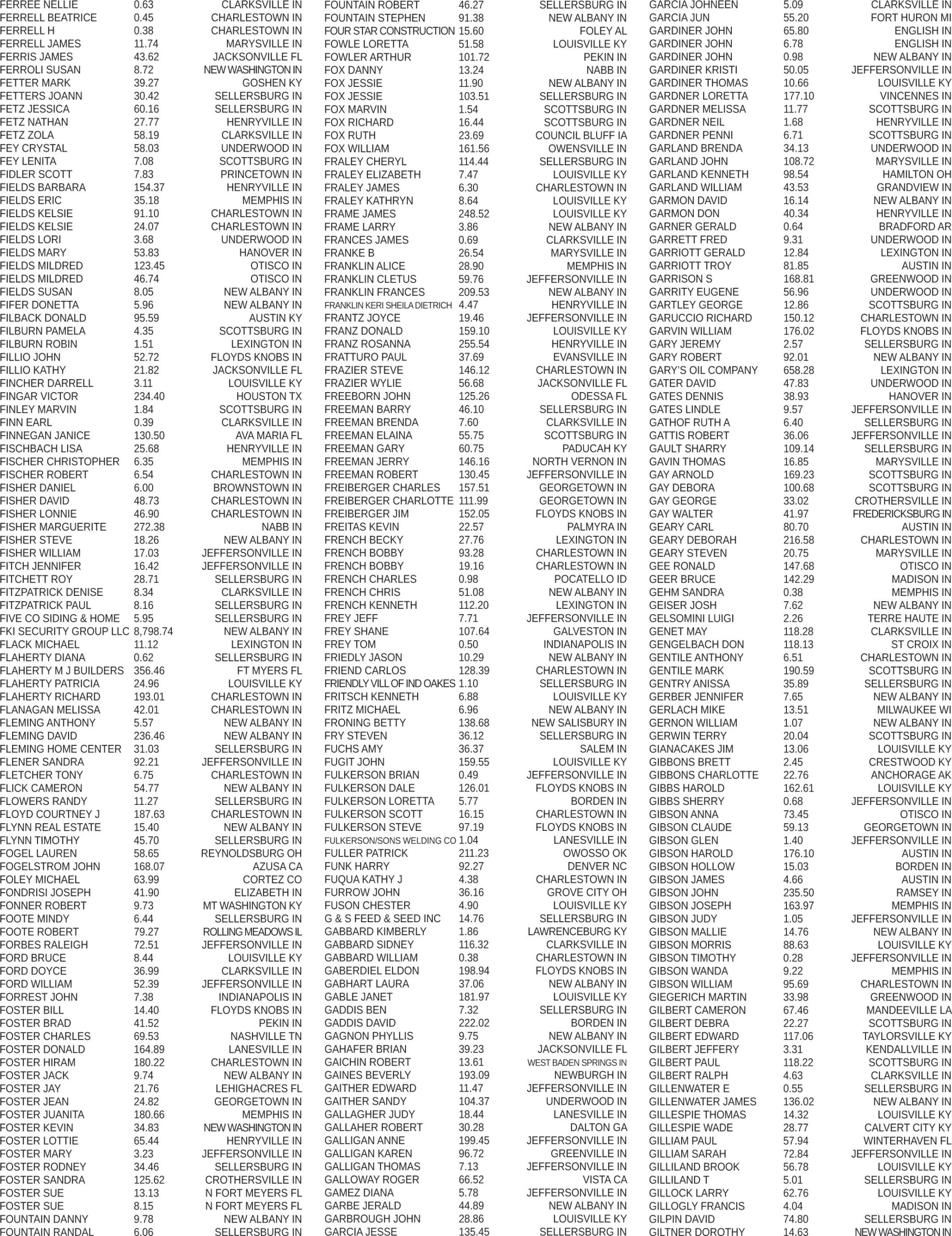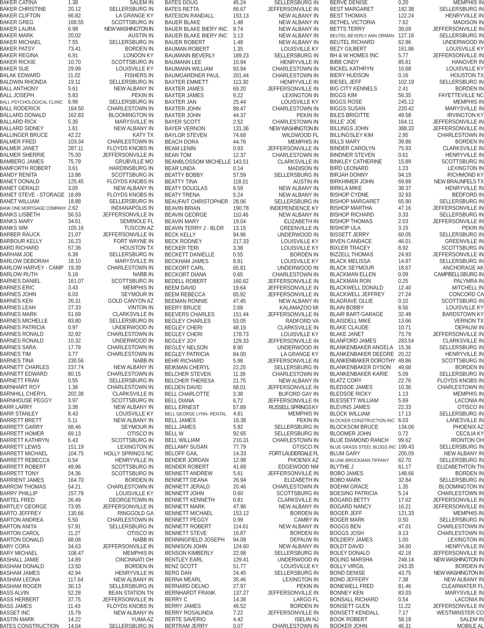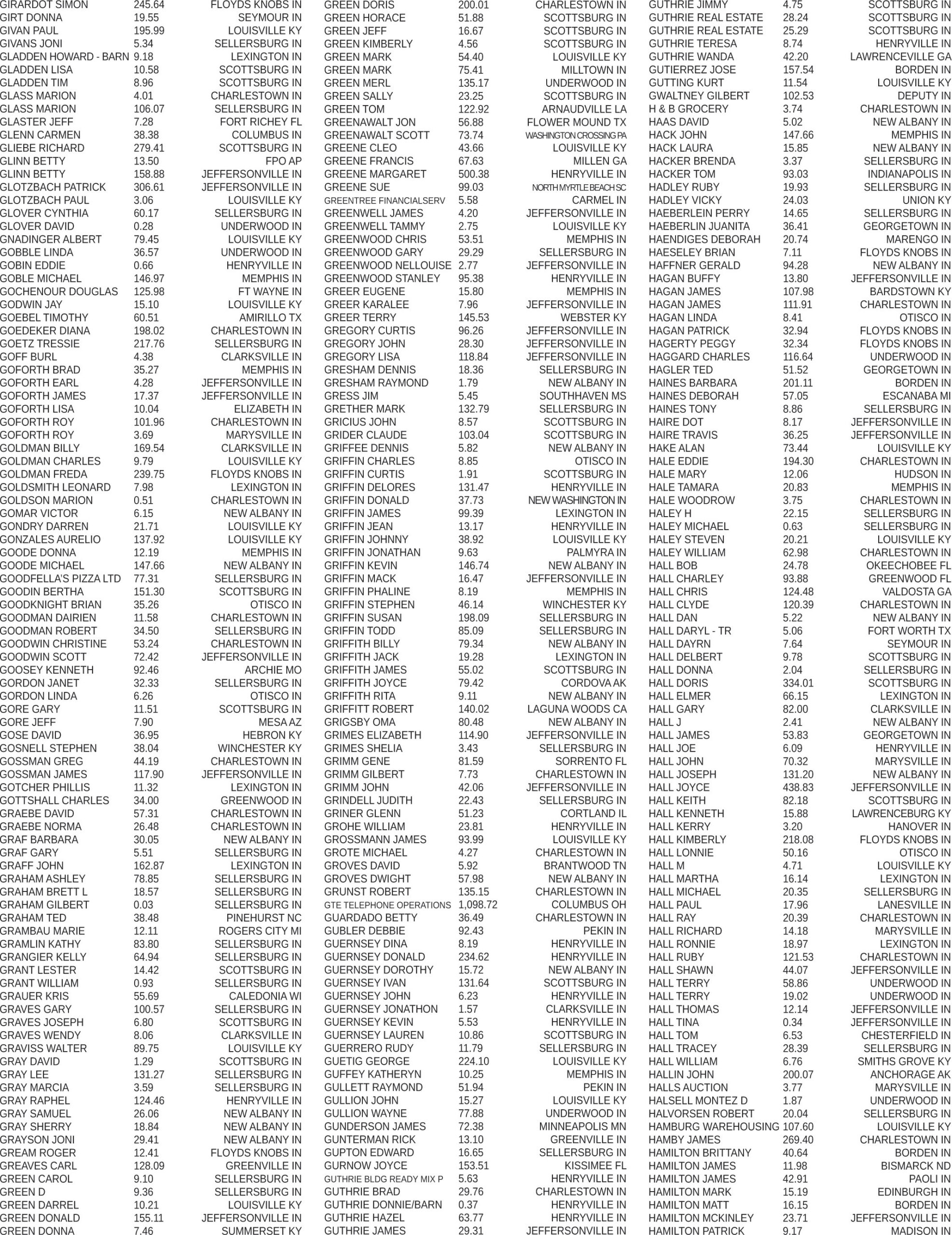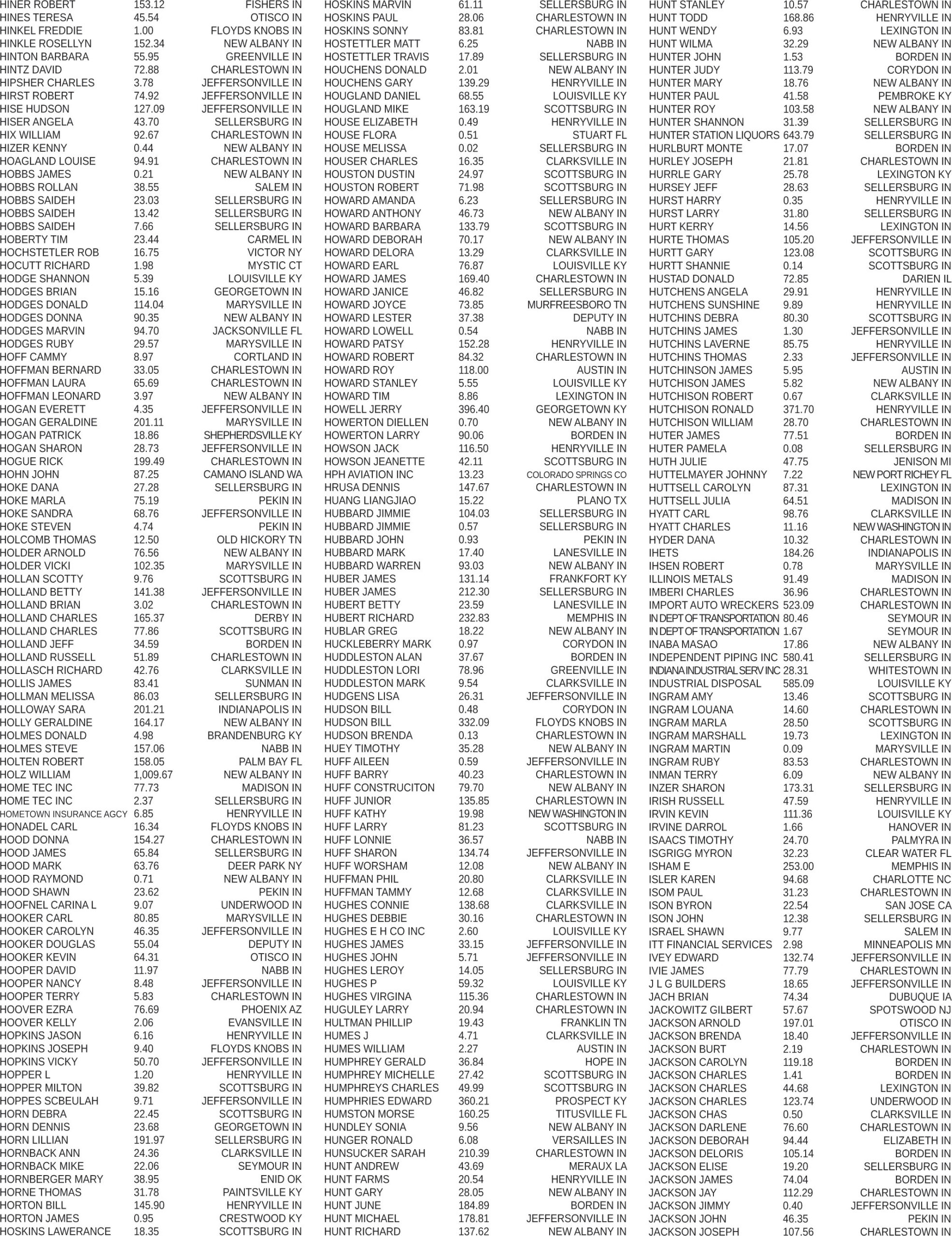 The following listing represents account balance and capital credit refund checks issued to current or former members of REMC which remain unclaimed at the current time. This listing includes the name, last known city and state of residence, and amount due to the member. If you are entitled to claim any of the following amounts, please call us at 812-246-3316. You must provide proper identification and a current mailing address so that we can issue a replacement check. Any amounts not claimed by the rightful recipients within 60 days of first being published will be reallocated among the current REMC membership. Please contact our office at 812-246-3316 if you have any questions.
