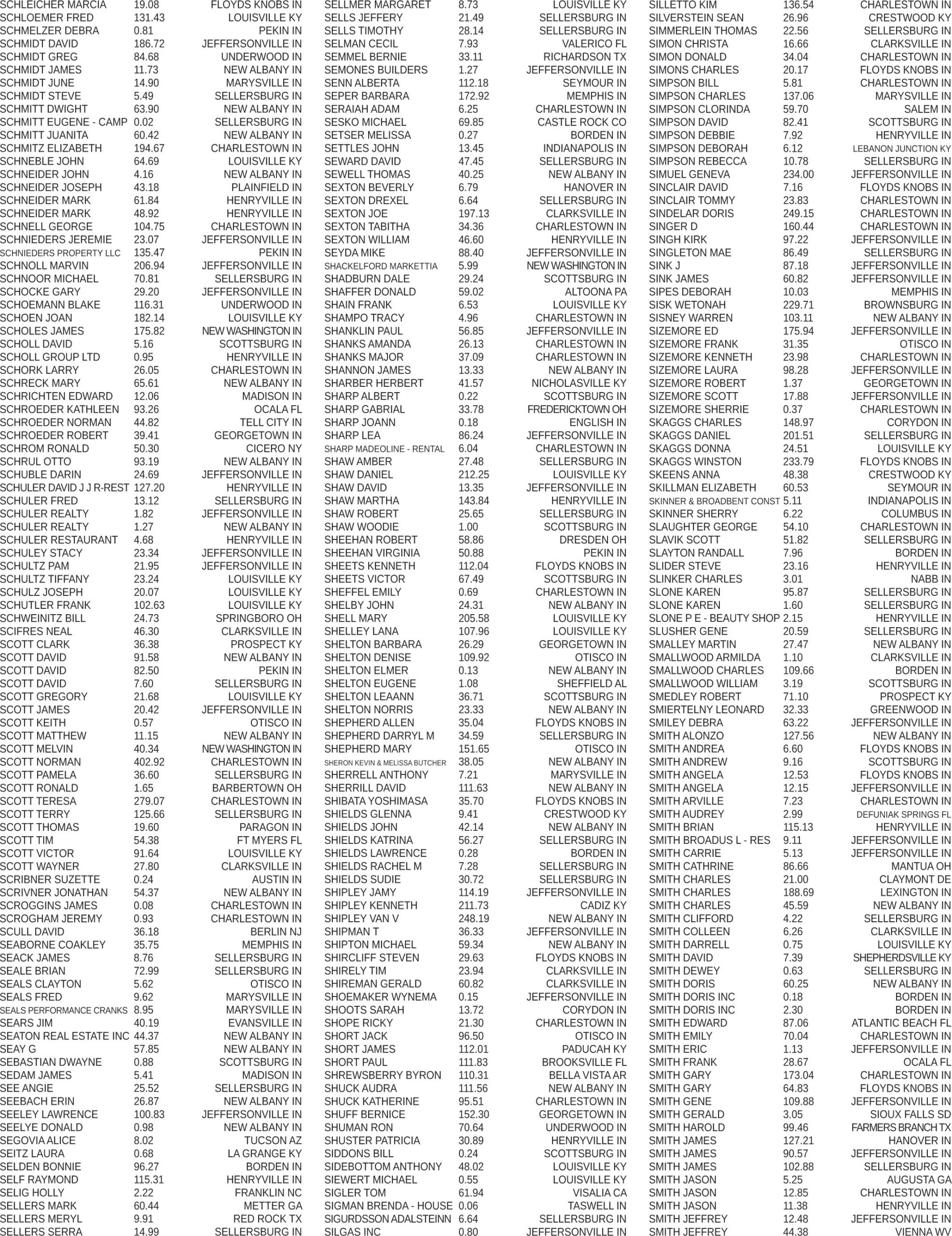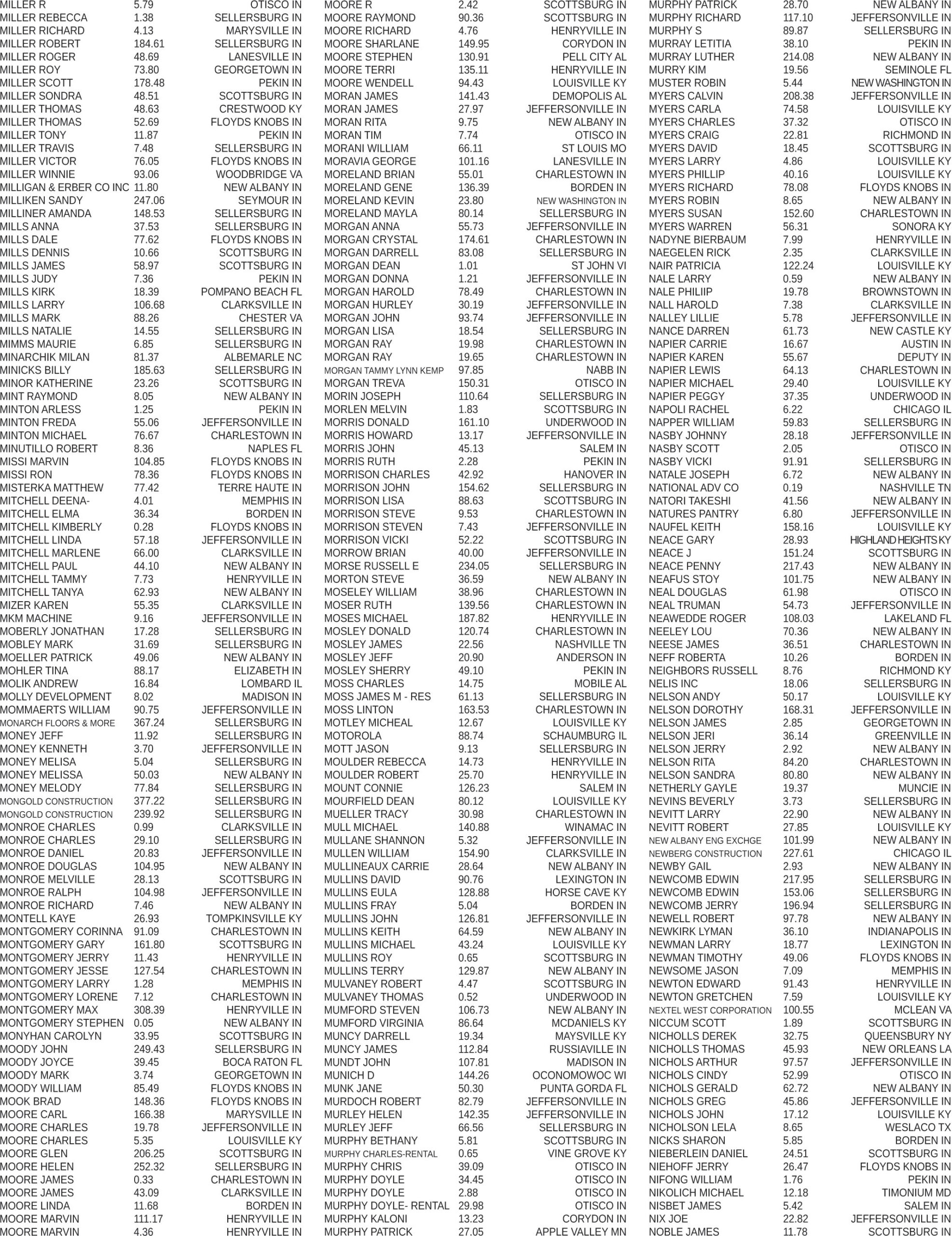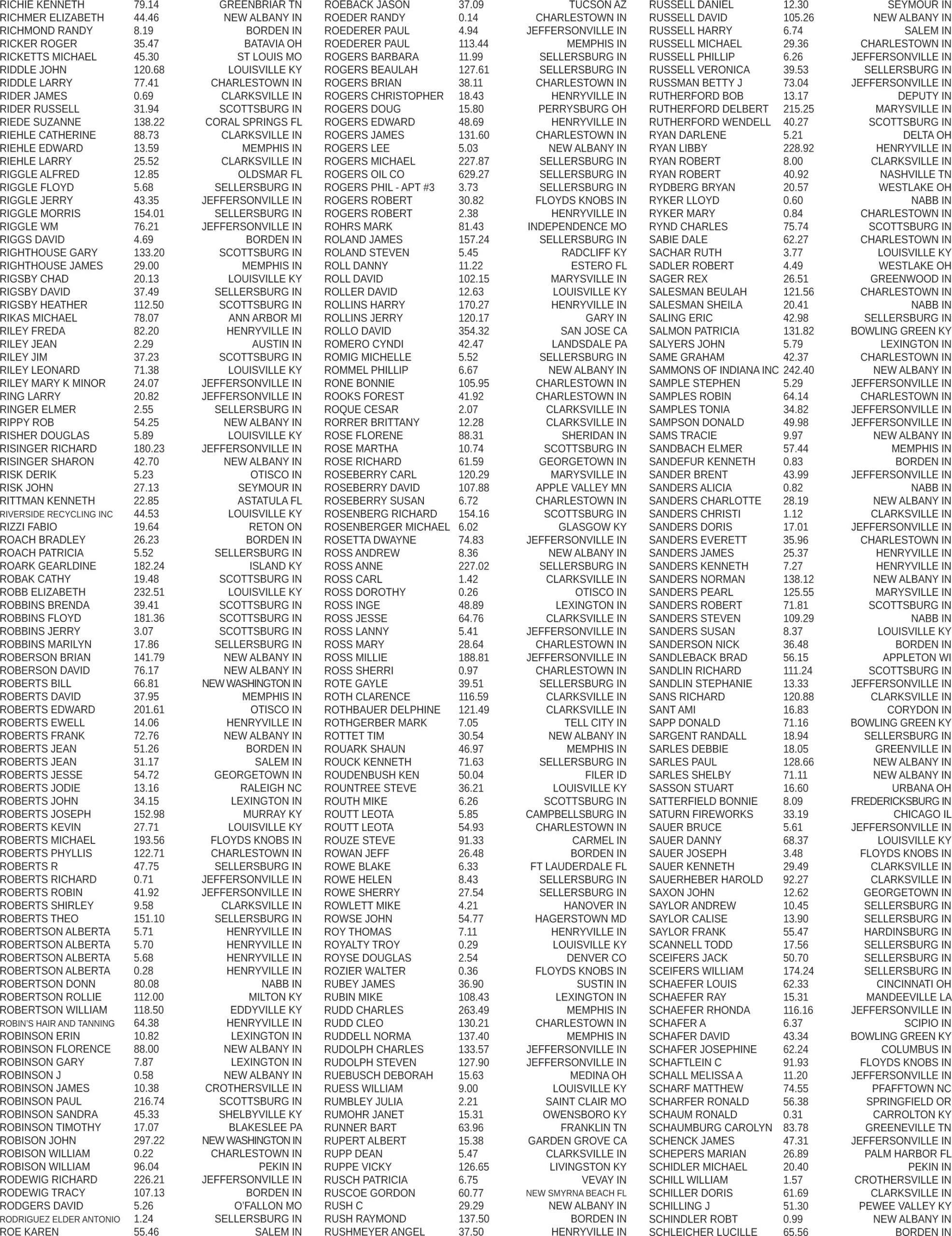 The following listing represents account balance and capital credit refund checks issued to current or former members of REMC which remain unclaimed at the current time. This listing includes the name, last known city and state of residence, and amount due to the member. If you are entitled to claim any of the following amounts, please call us at 812-246-3316. You must provide proper identification and a current mailing address so that we can issue a replacement check. Any amounts not claimed by the rightful recipients within 60 days of first being published will be reallocated among the current REMC membership. Please contact our office at 812-246-3316 if you have any questions.