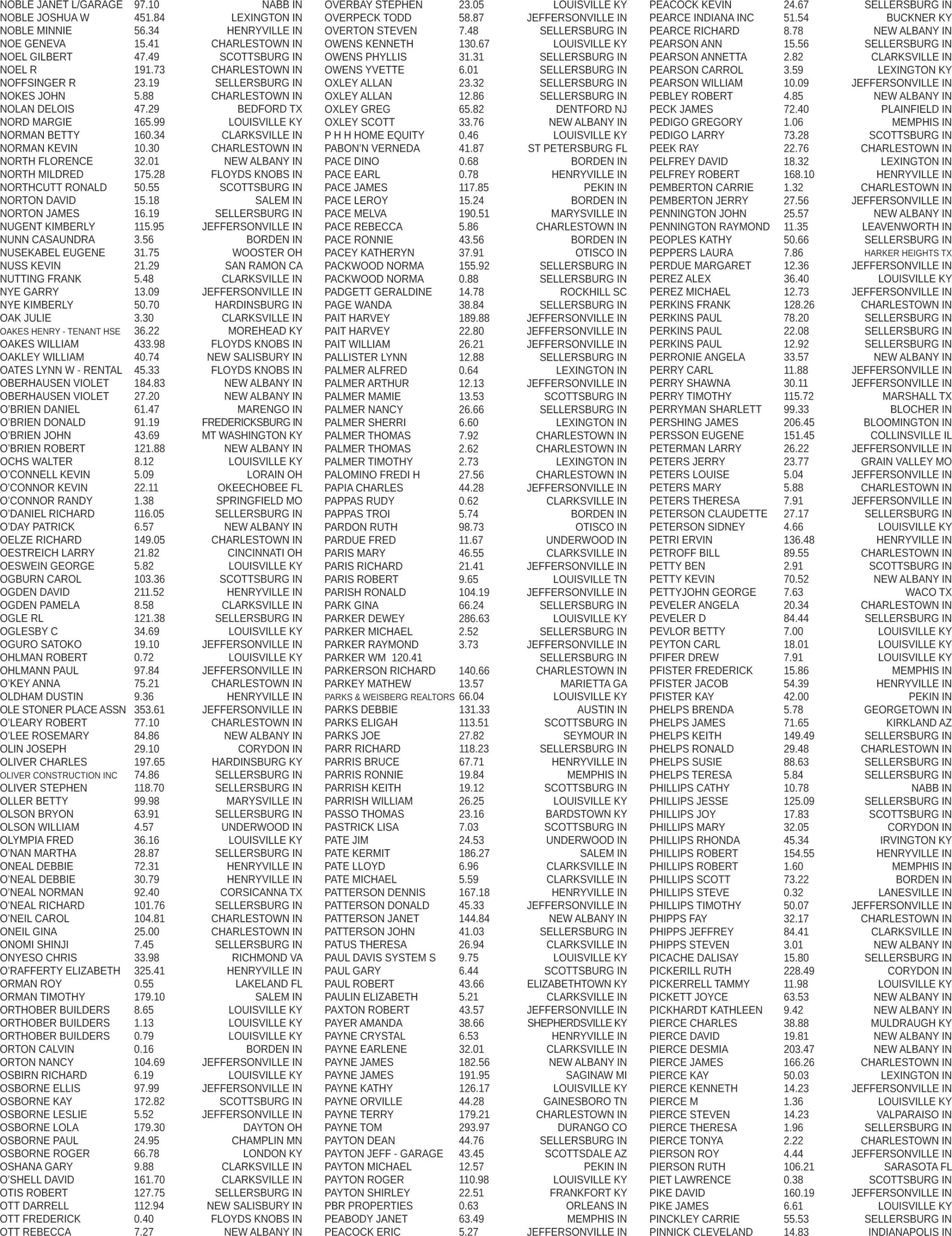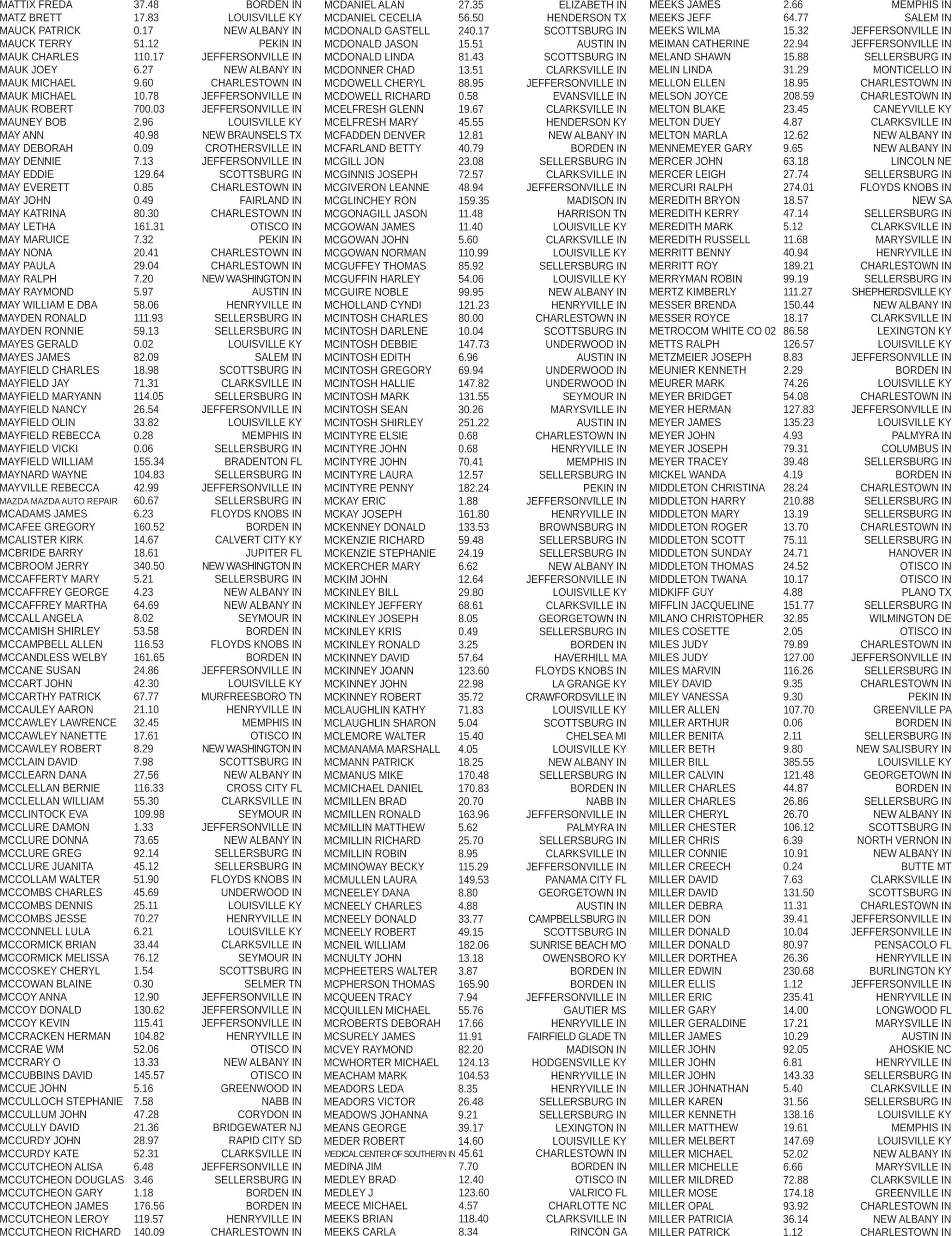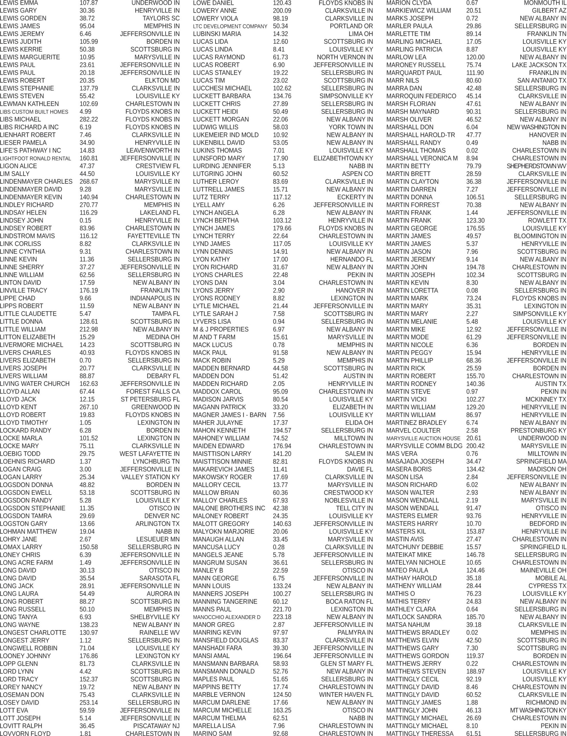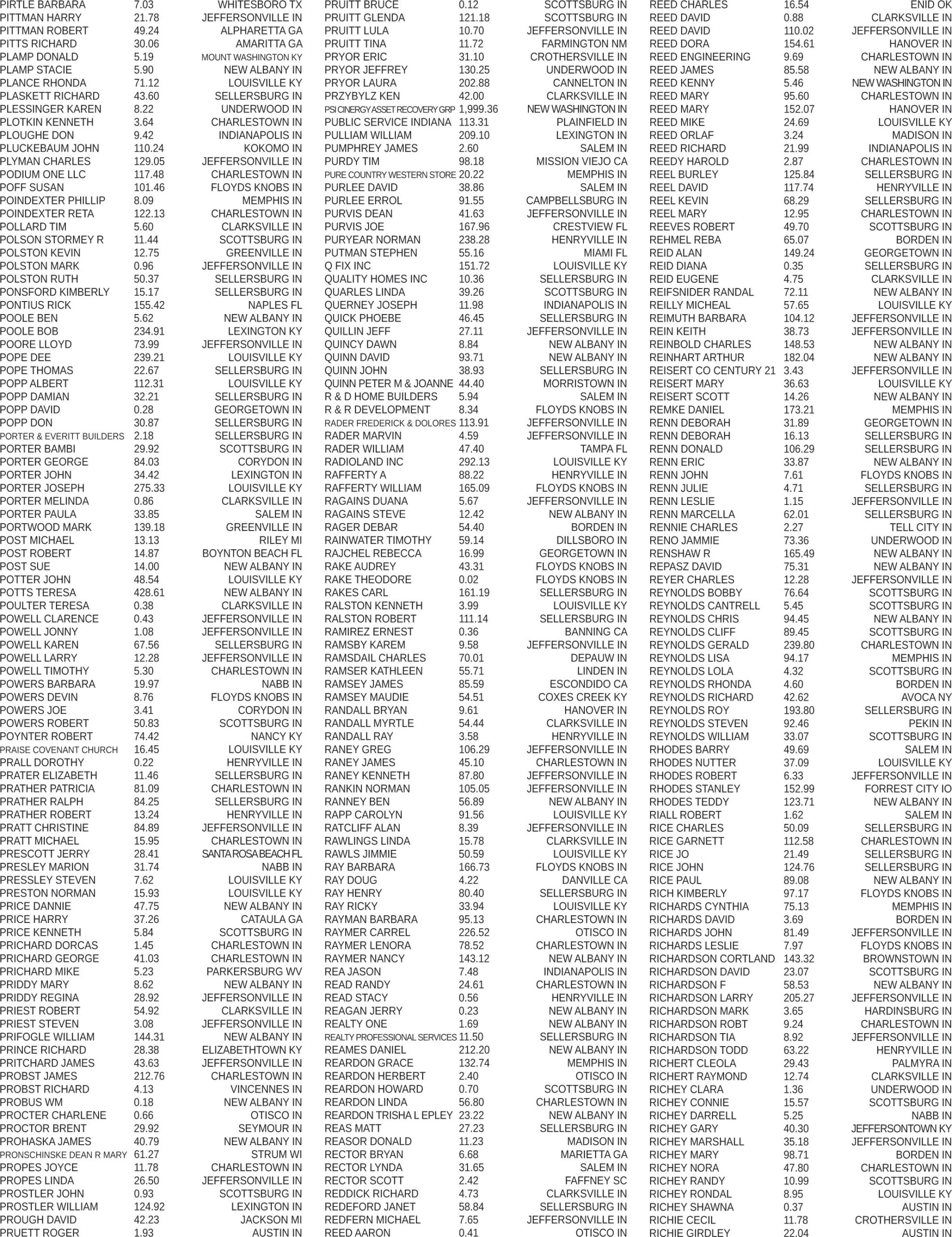 The following listing represents account balance and capital credit refund checks issued to current or former members of REMC which remain unclaimed at the current time. This listing includes the name, last known city and state of residence, and amount due to the member. If you are entitled to claim any of the following amounts, please call us at 812-246-3316. You must provide proper identification and a current mailing address so that we can issue a replacement check. Any amounts not claimed by the rightful recipients within 60 days of first being published will be reallocated among the current REMC membership. Please contact our office at 812-246-3316 if you have any questions.
