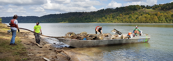 A crew from the Living Lands & Waters barge uses a smaller jon boat to gather trash and debris along the Ohio River banks. The crew takes the trash back to the main boat for it to be later recycled or disposed of properly.