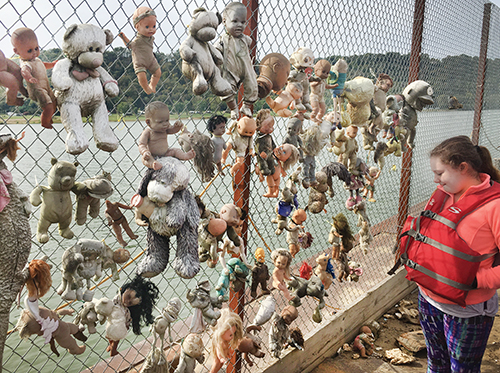 Alexis Hunt, looks over what the seventh graders at Madison Junior High said was the “creepiest” part of the barge experience: a chain link fence decked with various disfigured dolls and stuffed toys pulled from the rivers.