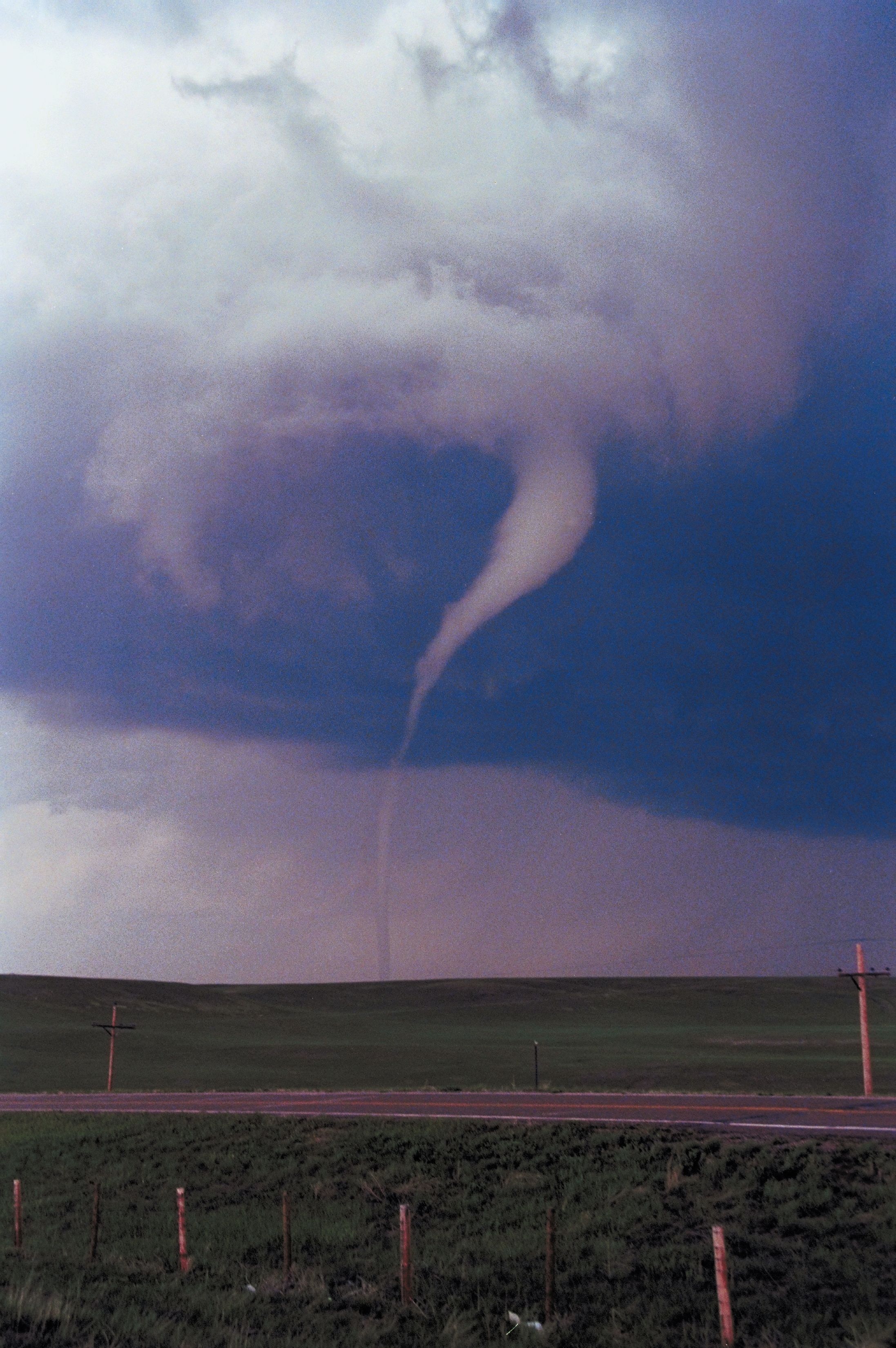 A tornado is a violently rotating column of air descending from a thunderstorm and in contact with the ground. Though tornadoes are usually brief, lasting only a few minutes, they can sometimes last for more than an hour and travel miles, causing considerable damage and death.