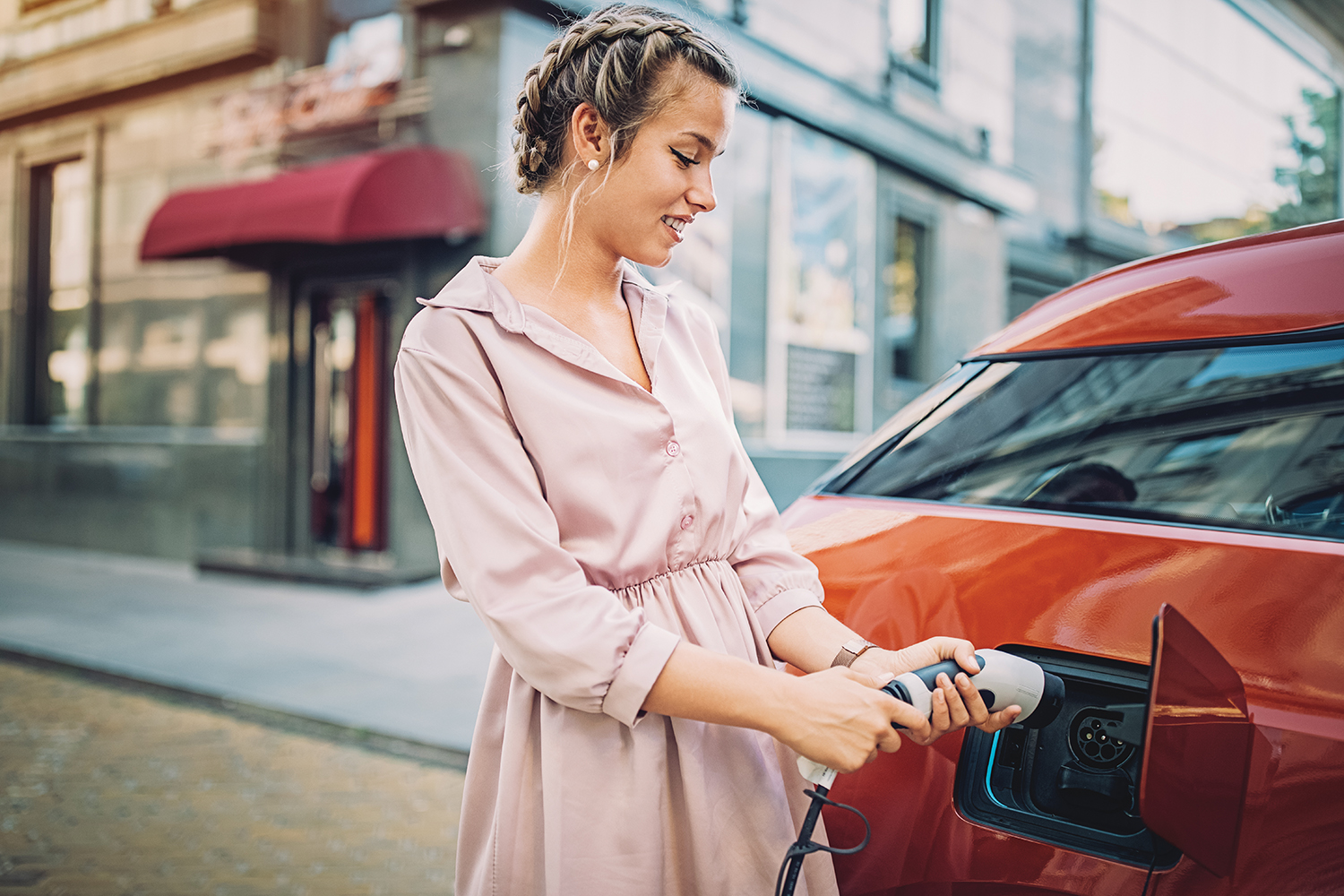 Young girl is charging her electric car in the city