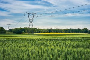 High voltage poles standing in a field under a blue sky. Juicy green fields on a colorful summer country landscape.