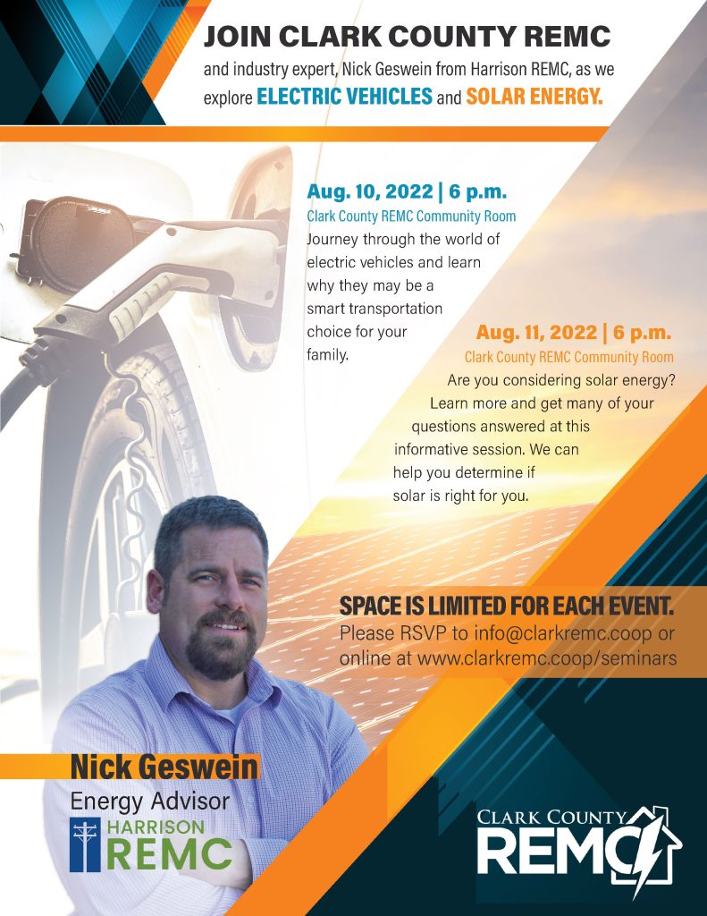 EV and Solar Energy Seminars By Indiana Connection Posted on Jul 08 2022 in Clark County REMC Related Stories Hoosier Energy advances pollinator habitat conservation efforts Providing reliable service while staying financially strong Donate to our food drive