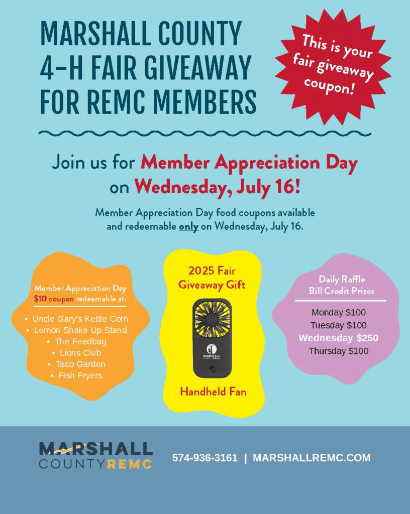 We’re showing our appreciation with fair food, free gifts, and some exciting chances to win money towards your REMC bill at the Marshall County 4-H Fair — with a special spotlight on Member Appreciation Day, Wednesday, July 16!