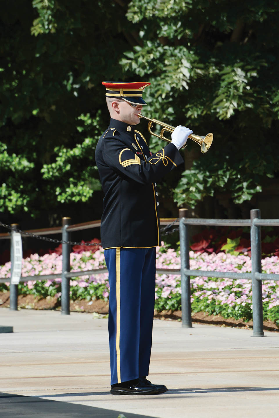 A bugler sounding Taps — the 24 saddest yet, ultimately, most hopeful notes (“God is nigh”) known to veterans — concludes the laying of the wreath at the Tomb of the Unknowns at Arlington National Cemetery. The solemn ceremony is a part of most all Honor Flights.