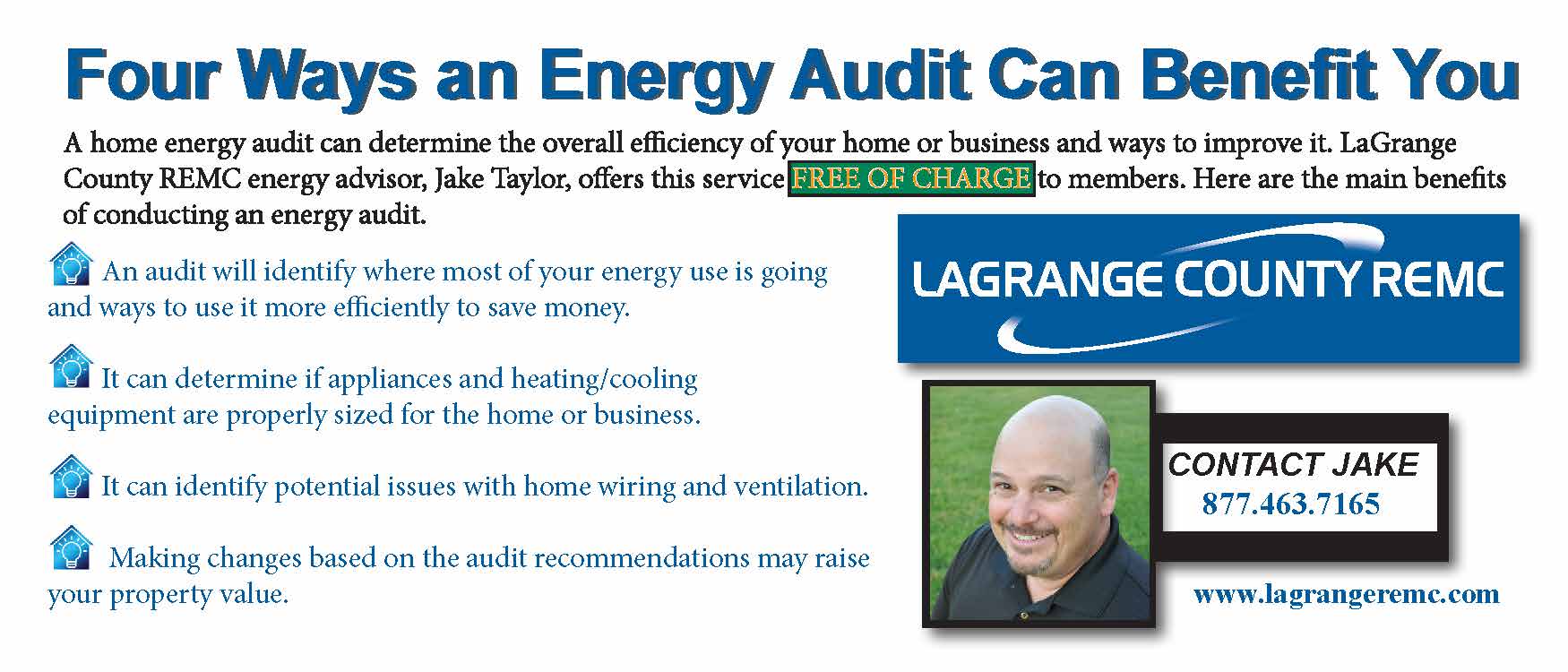Four ways an energy audit can benefit you By Indiana Connection Posted on Mar 07 2026 in LaGrange County REMC Related Stories Answering your rate questions Your generosity is making a difference! Klopfenstein graduates lineworker program