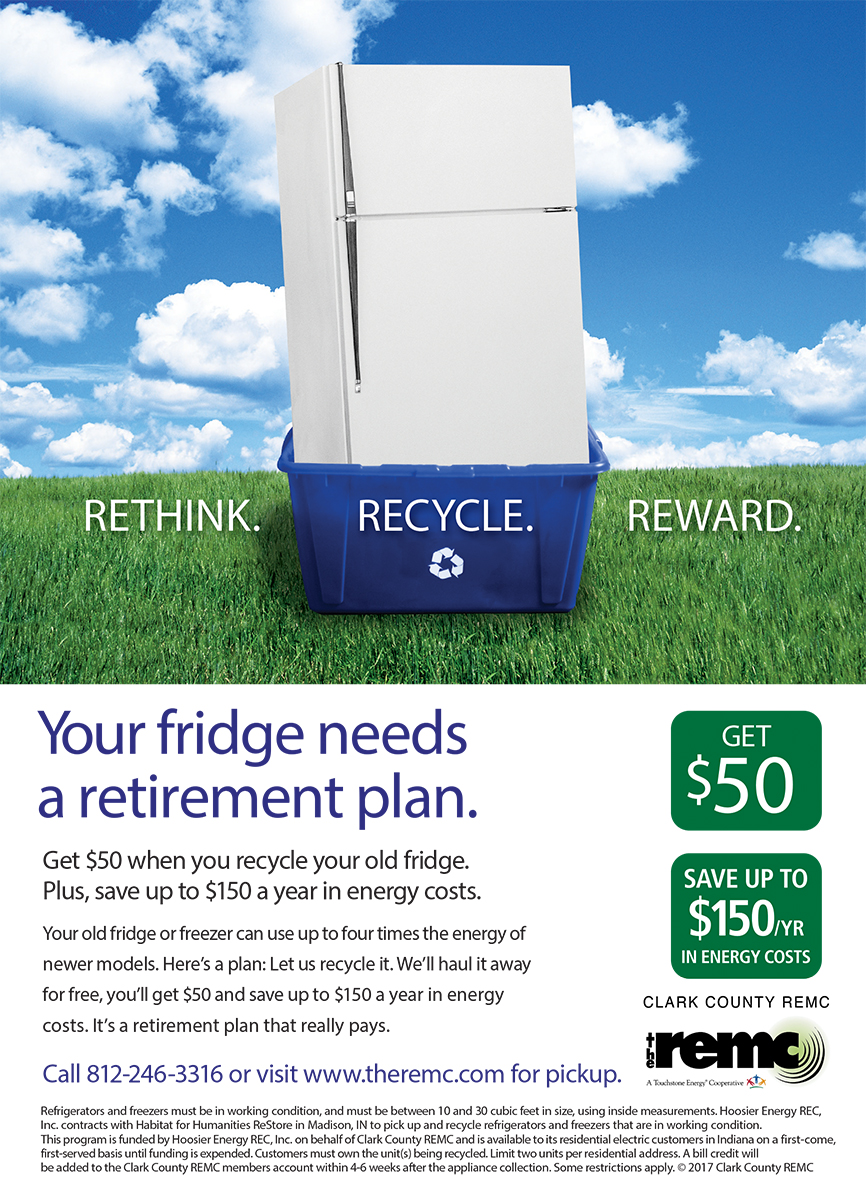 Your fridge needs a retirement plan By Ellie Schuler Posted on Aug 25 2017 in Clark County REMC Related Stories Hoosier Energy advances pollinator habitat conservation efforts Providing reliable service while staying financially strong Donate to our food drive