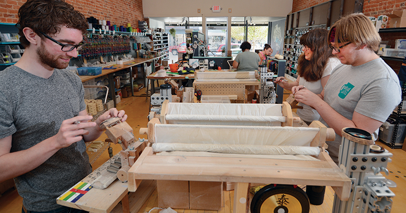 MudLove employees, Tim Strider, from left, Beth Prall and Bryce Hoffhein, work on clay bracelets by punching the shape and holes from clay using specially designed equipment. They then use fine clay tools to perfect the pieces.