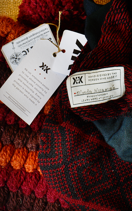 Handknitted scarves and hats sold at Amerie come with the knitter’s name. The profits for the items go directly back to the knitter, many of whom are women who have escaped the sex trade and poverty and are looking to better their lives.