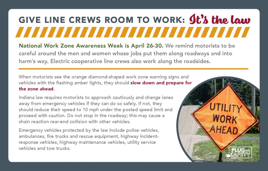 Give Crews Room To Work Work Zone Awareness Week is April 26-30 By Indiana Connection Posted on Apr 03 2021 in Clark County REMC Related Stories Hoosier Energy advances pollinator habitat conservation efforts Providing reliable service while staying financially strong Donate to our food drive
