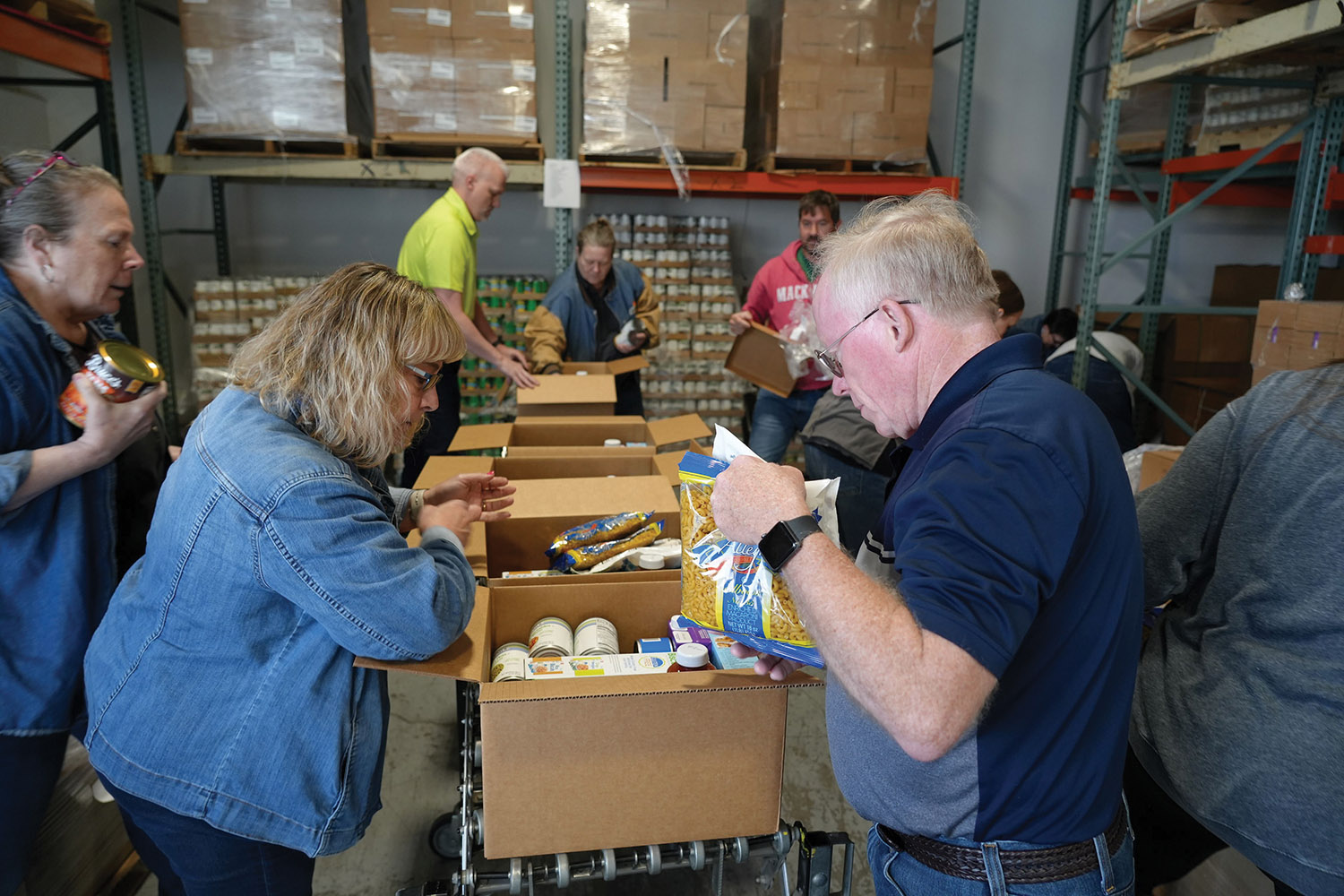 Community Impact Week continued Wednesday with a pair of events that occurred simultaneously. At Hoosier Hills Food Bank, a group of approximately 15 employees formed an assembly line to fill boxes for the Commodity Supplemental Food Program (CSFP), which aims to help low-income individuals aged 60 and over. Recipients receive two boxes of food and two blocks of cheese every other month. The CSFP at Hoosier Hills provides more than 1,000 boxes per month, and there is currently