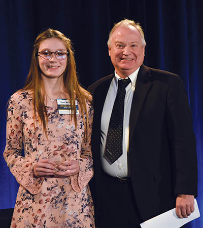 Zeta Whitmer, an eighth grader at Rochester Middle School, poses for a photo with Joe Koch, CEO of Fulton County REMC, at Indiana Electric Cooperatives’ annual meeting in December.