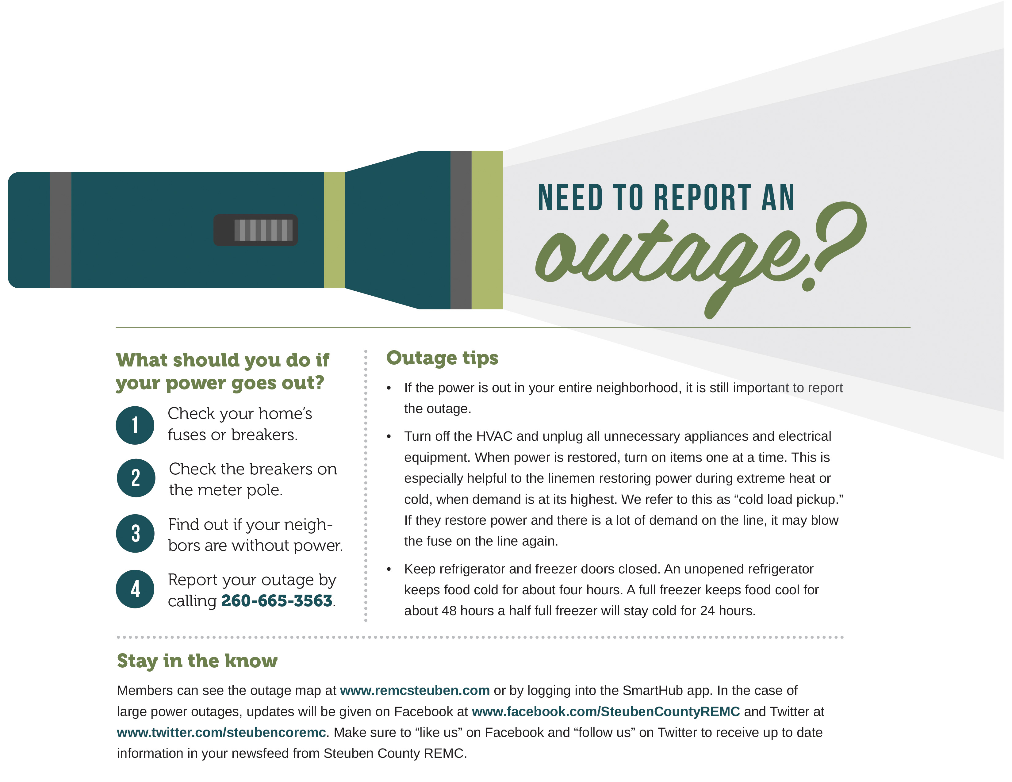 Have a power outage? Here are the steps you should take and some tips you could use By Indiana Connection Posted on Apr 29 2020 in Steuben County REMC Related Stories Want to serve your community? Broadband internet for your home and business from Steuben County REMC Calendar