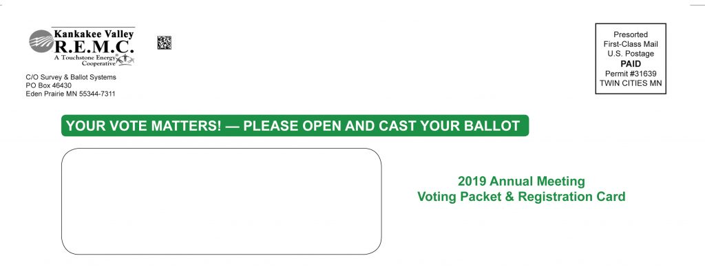 Voting for your board of directors is an important part of being a KVREMC member-consumer. Remember, you can vote using the paper ballot you received in the mail (in an envelope like the one shown below), or online using the information given to you in the voting packet until June 13. After that date, you can only vote at the annual meeting.
