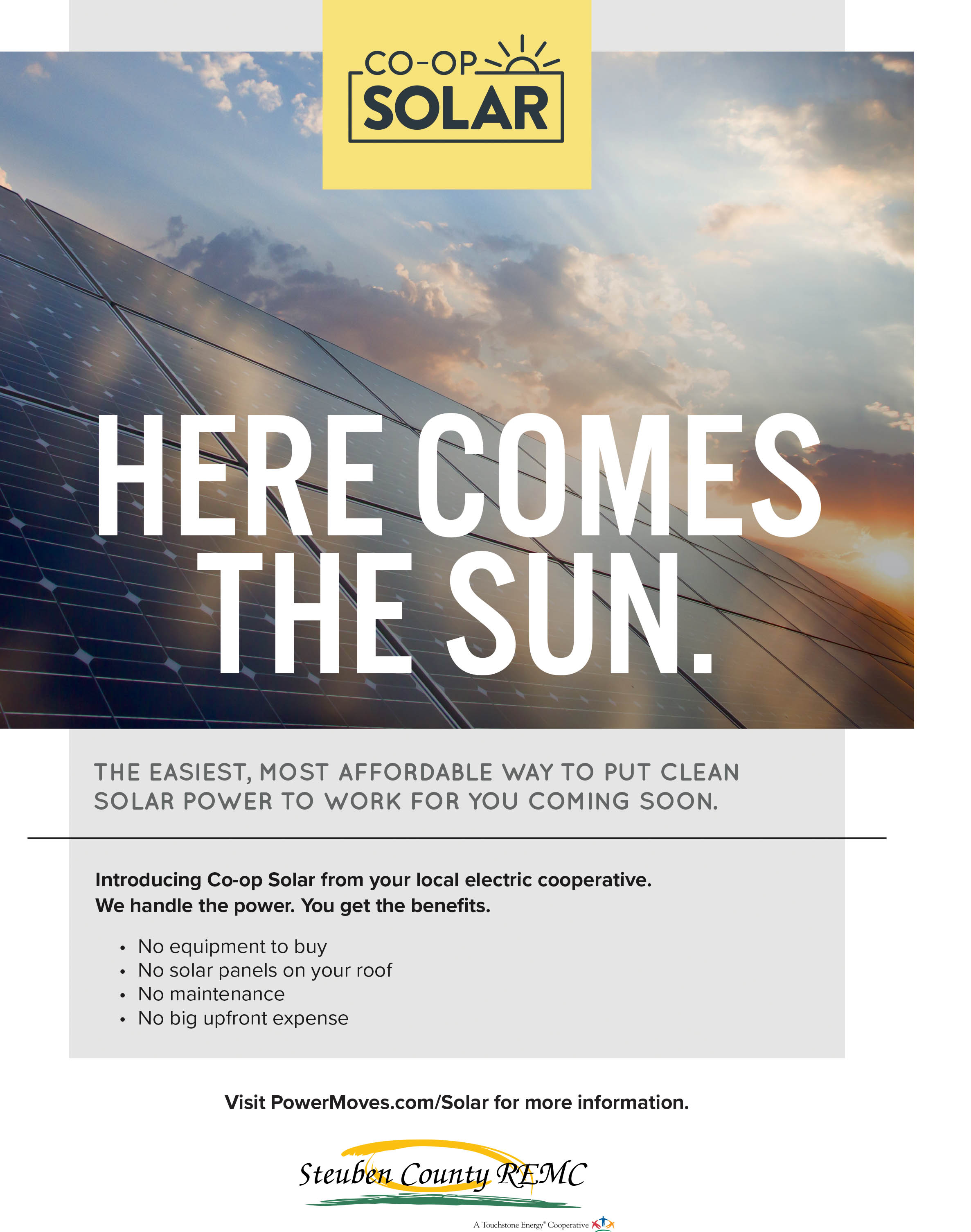 Here comes the sun By Ellie Schuler Posted on Dec 26 2017 in Steuben County REMC Related Stories Want to serve your community? Broadband internet for your home and business from Steuben County REMC Calendar
