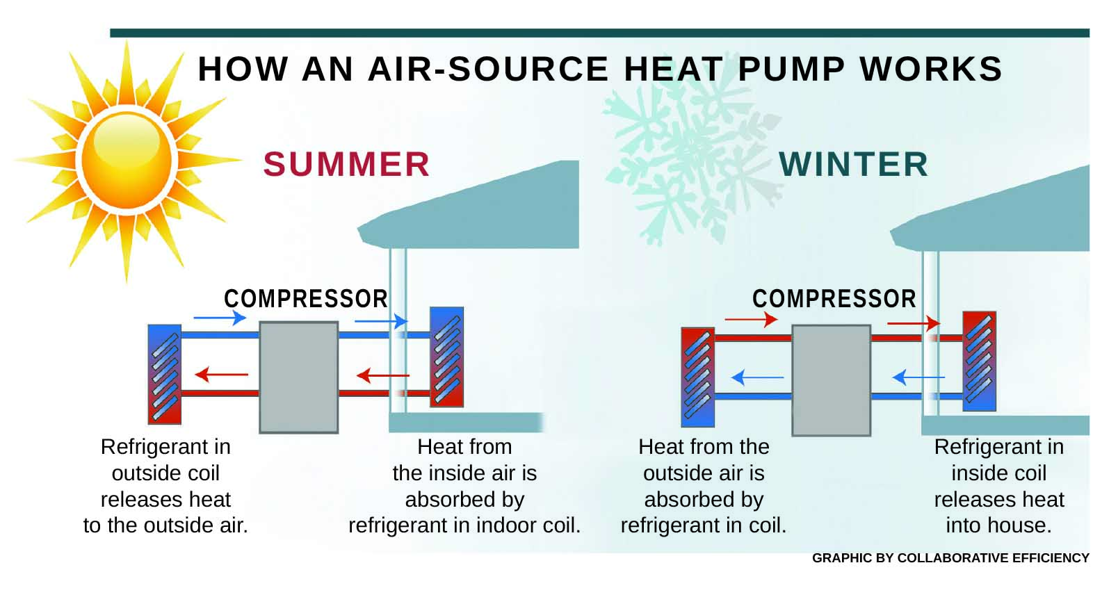 In the summer, an air-source heat pump acts as an air conditioner that draws heat from your home’s air and transfers it outside. In the winter, the system’s direction is reversed so that heat is pulled from the outside air and moved into your home.