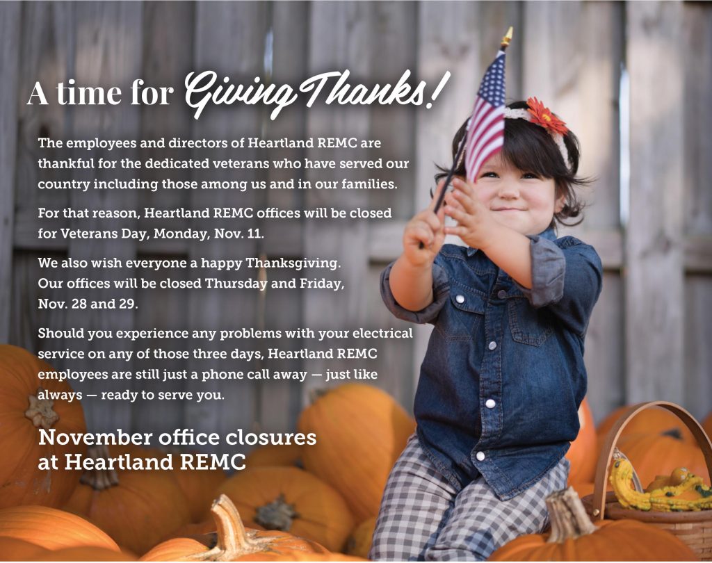 Holiday closings announced By Indiana Connection Posted on Nov 04 2019 in Heartland REMC Related Stories Reflecting on 2025, building for 2026 Ready for the unexpected: How to prepare for winter storms Home lighting 101