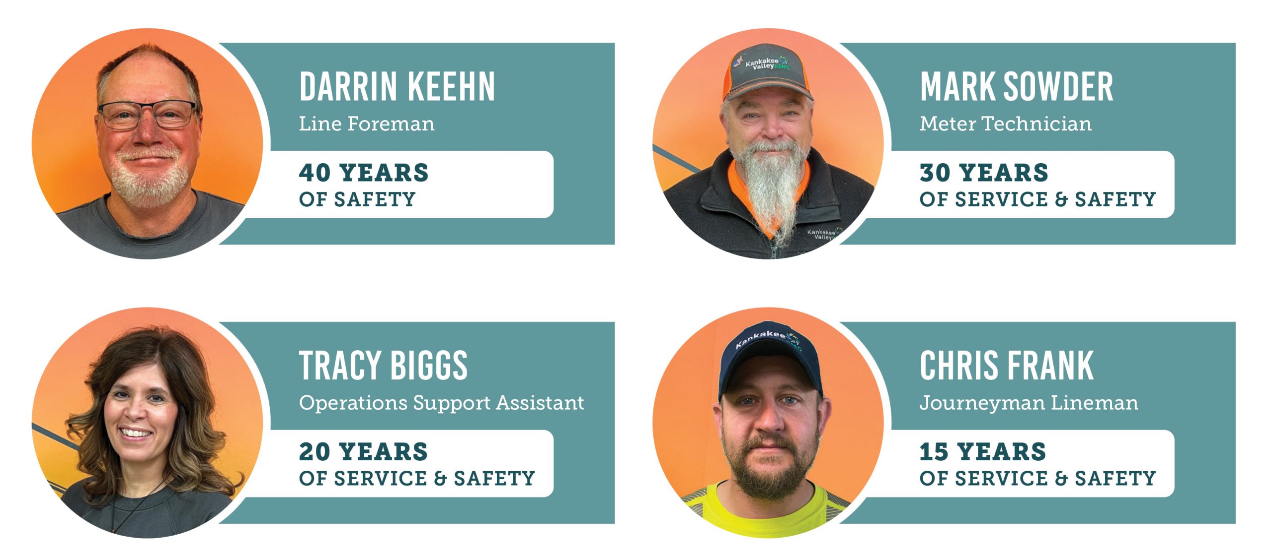 Kankakee Valley REMC recently honored four employees for their milestone years of service and safety at the annual awards banquet. These individuals gave a combined 65 years of service and 105 years of safety to the cooperative. Congratulations and thank you for your commitment to the membership and cooperative.