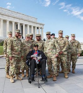 Korean War veteran David Pickett sits in front of the Lincoln Memorial, accompanied by a group of active duty military.