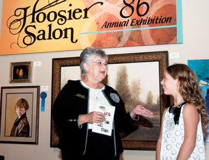 Donnae Dole, executive director of the Hoosier Salon, congratulates third grader Grace Overdorf at a reception for the 2011 Cooperative Calendar of Student Art winners at the Indiana State Museum, Sept. 30.