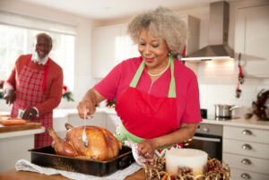 Senior black woman basting a roast turkey in preparation for Christmas dinner, her husband chopping vegetables in the background, front view, close up By hhuffman Posted on Oct 29 2024 in