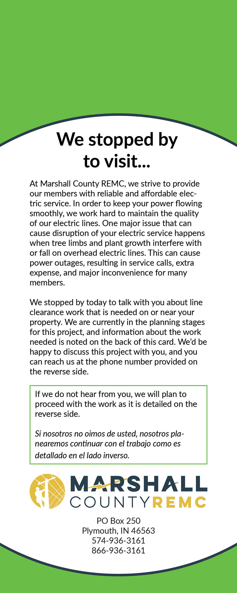 “This is a perfect time to ask questions or discuss trees you may be concerned about,” said Tod Brems, operations manager of Marshall County REMC. “If you have concerns about the planned clearance work, don’t hesitate to call the number provided on the door hanger.”