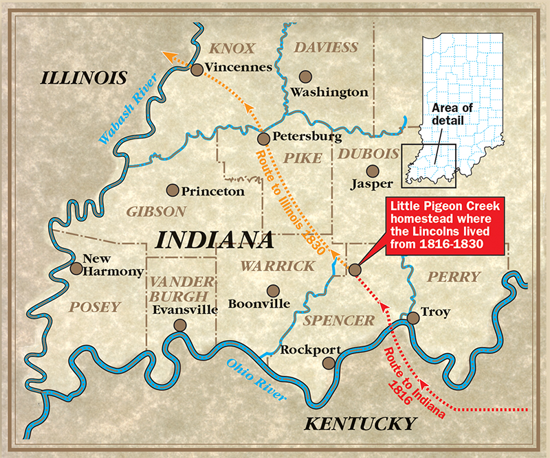 Abraham Lincoln was 7 years old when he first came to Indiana with his father, Thomas; mother, Nancy; and sister Sarah, in December of 1816. The move coincided within days of Indiana’s statehood. They settled near the Ohio River in an area of Perry County that two years later became Spencer County.