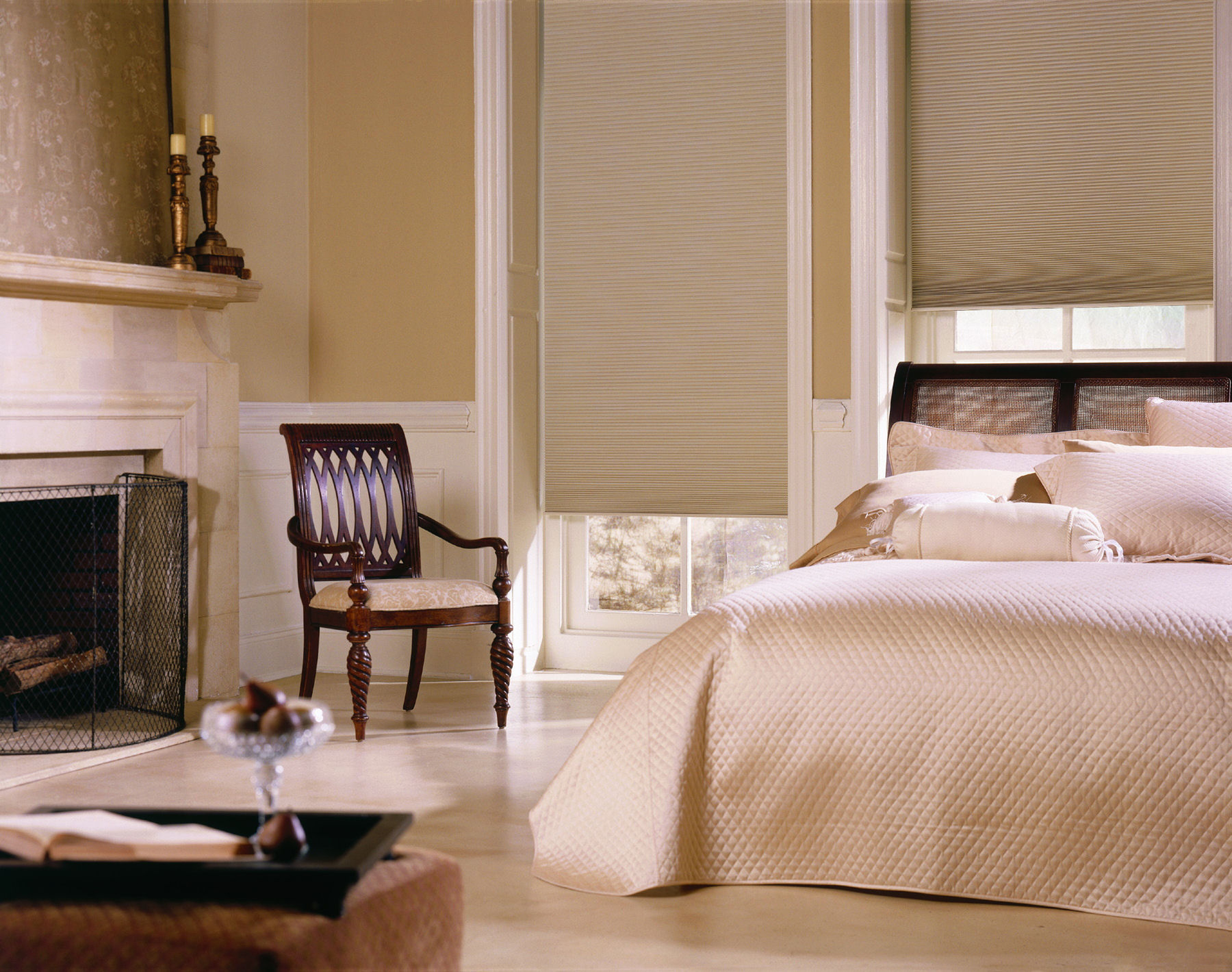 These are double-cell light-blocking cellular shades. They slide in tracks on the sides to reduce air flow and drafts from the cold window glass — and they look elegant in any application. Photo by Cellular window shades.