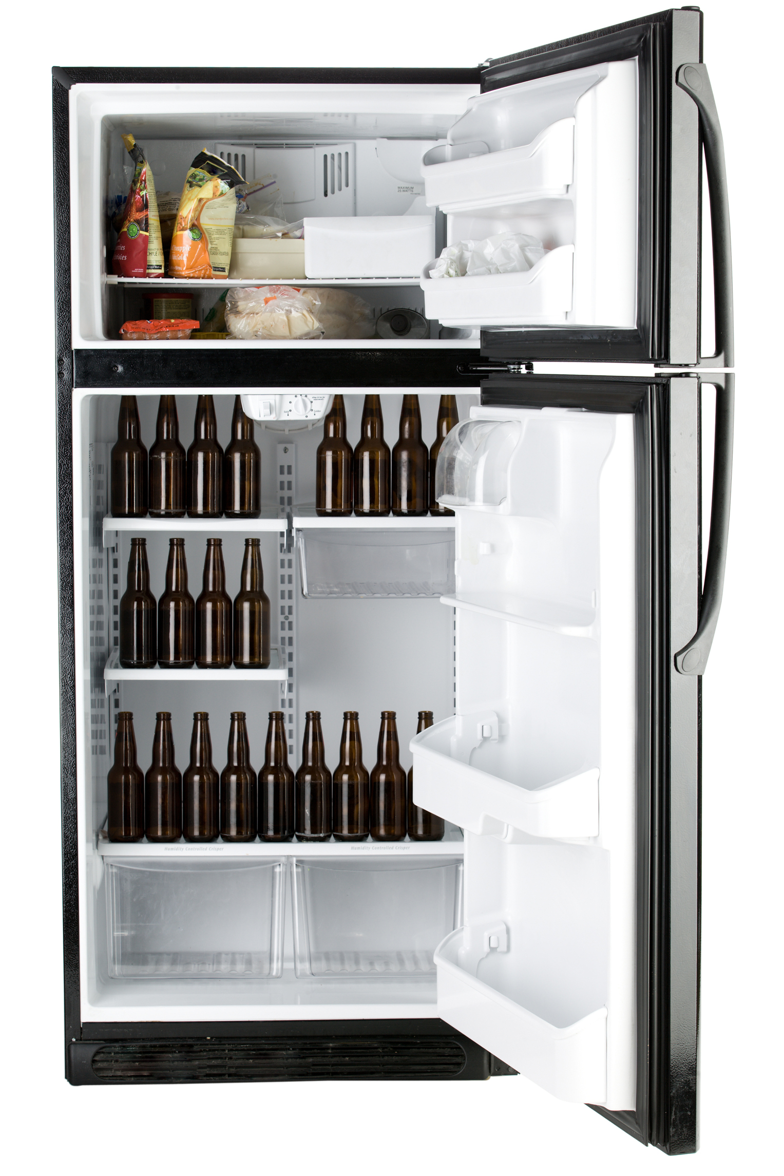 Refrigerator stocked with beer and food