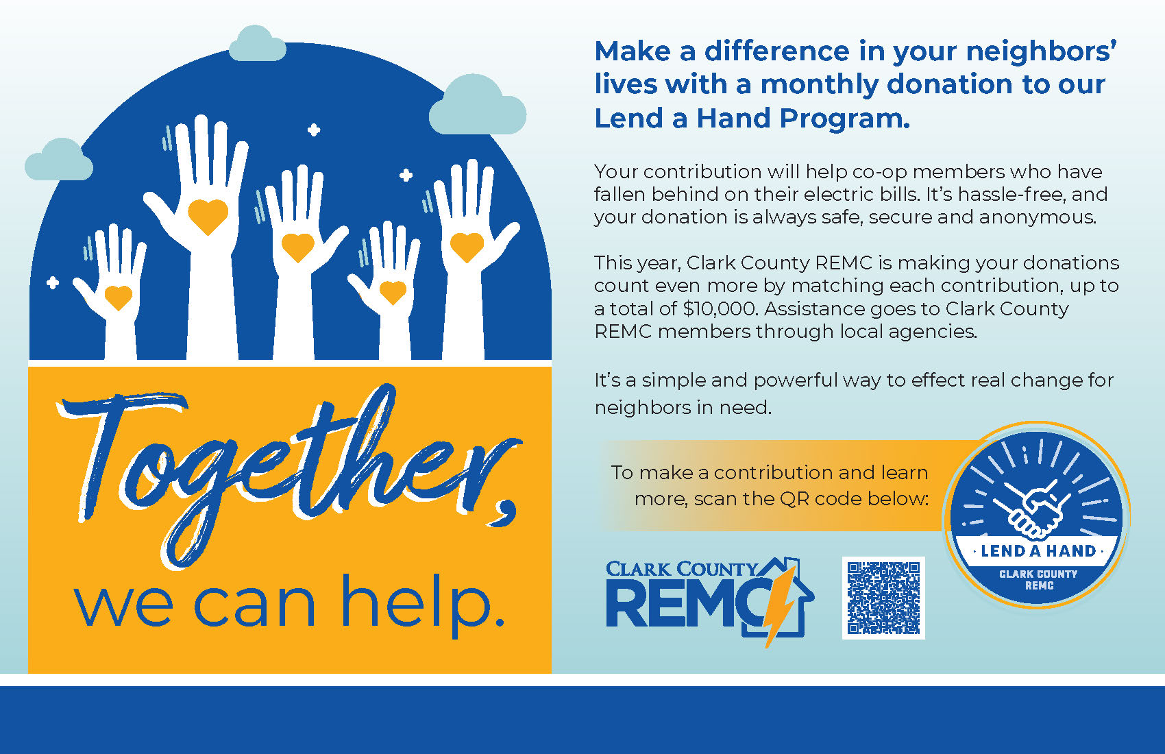 Join our Lend a Hand progam By Indiana Connection Posted on Sep 02 2023 in Clark County REMC Related Stories Hoosier Energy advances pollinator habitat conservation efforts Providing reliable service while staying financially strong Donate to our food drive