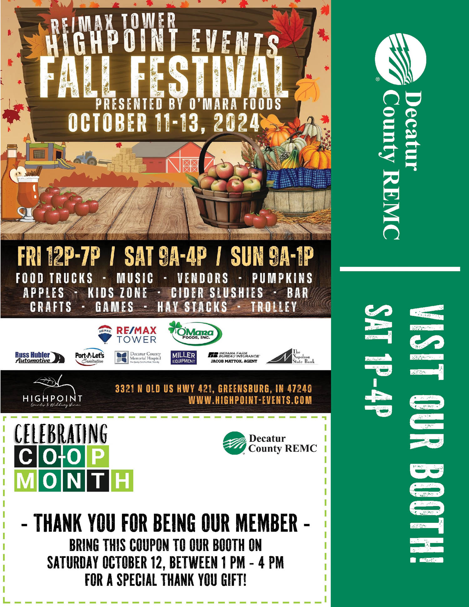 Join us at the Highpoint Events Fall Festival By Indiana Connection Posted on Oct 03 2024 in Decatur County REMC Related Stories Unclaimed capital credits Powering progress Join us for Cocoa and Cookies on Dec. 16