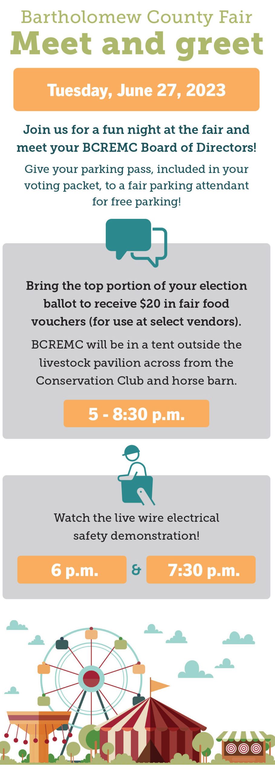 Join us for a Meet and Greet at the county fair By Indiana Connection Posted on Jun 11 2023 in Bartholomew County REMC Related Stories Hoosier Energy advances pollinator habitat conservation efforts Planning ahead for reliable power Bartholomew County REMC Shred Event