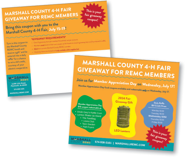 You can collect your coupon from the Marshall County REMC booth at the fair by turning in a voucher. Your voucher is included in the middle of this magazine as a postcard. Simply remove the voucher from the magazine and hand it into the REMC booth at the fair.