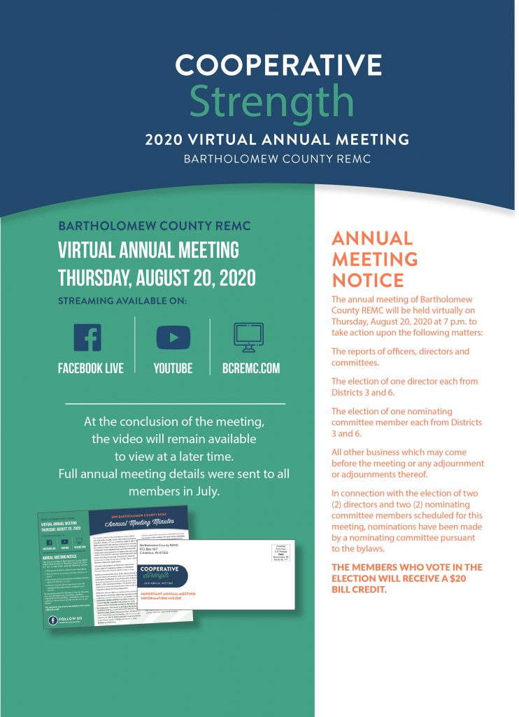 Join us for your annual meeting! The BCREMC Annual Meeting will take place virtually on Aug. 20 By Indiana Connection Posted on Jul 31 2020 in Bartholomew County REMC Related Stories Hoosier Energy advances pollinator habitat conservation efforts Planning ahead for reliable power Bartholomew County REMC Shred Event