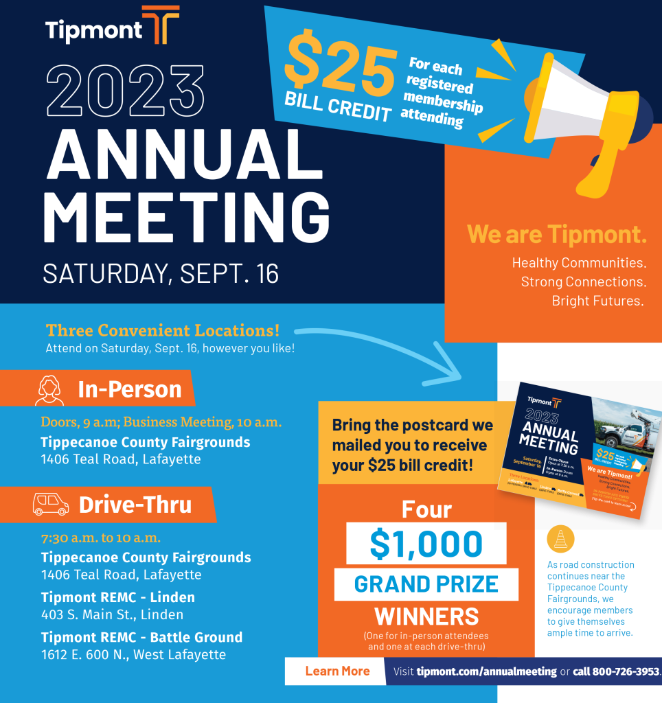 Join us for your annual meeting on Sept. 16 By Indiana Connection Posted on Sep 04 2023 in Tipmont Related Stories Where does the power come from? Electric rates to increase by 5% Camp Kilowatt 2025