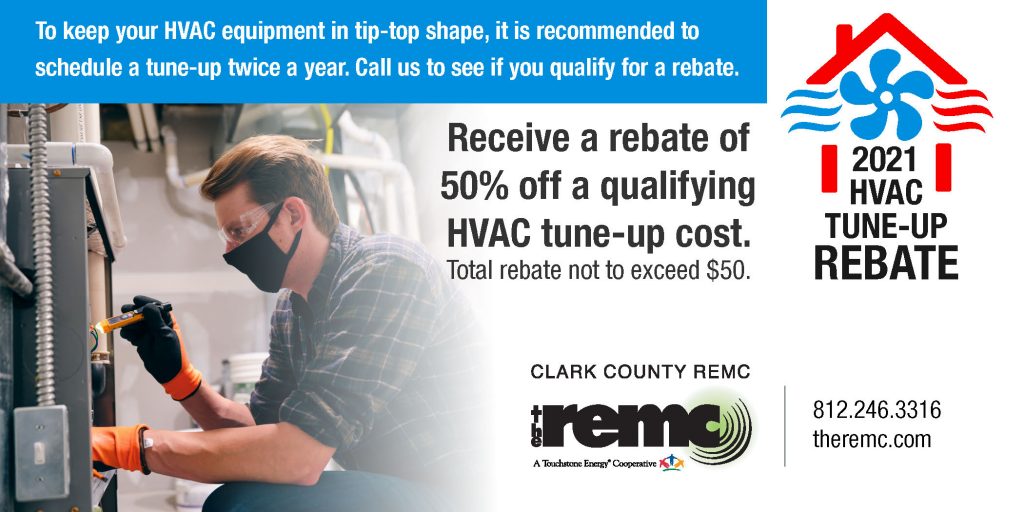 Keep your HVAC equipment in tip-top shape Earn an hvac tune up rebate from clark county remc By Indiana Connection Posted on Jul 07 2021 in Clark County REMC Related Stories Hoosier Energy advances pollinator habitat conservation efforts Providing reliable service while staying financially strong Donate to our food drive