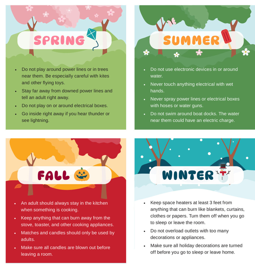 Kids Corner: Four seasons of safety By Indiana Connection Posted on May 04 2025 in Features Each season has unique electrical and fire dangers. Stay safe all year round by following these tips. Related Stories Use your generator safely this winter How to stay safe during a winter storm 10 steps to winterize your home
