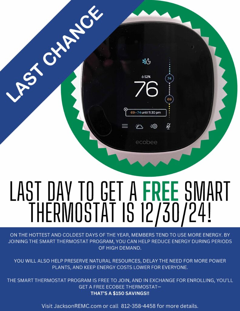 Last chance for FREE thermostat By Indiana Connection Posted on Dec 15 2024 in Jackson County REMC Related Stories Hoosier Energy advances pollinator habitat conservation efforts Protect what matters most with Jackson County REMC Community Day 2025: Jackson County REMC serves the Scott County Clearinghouse