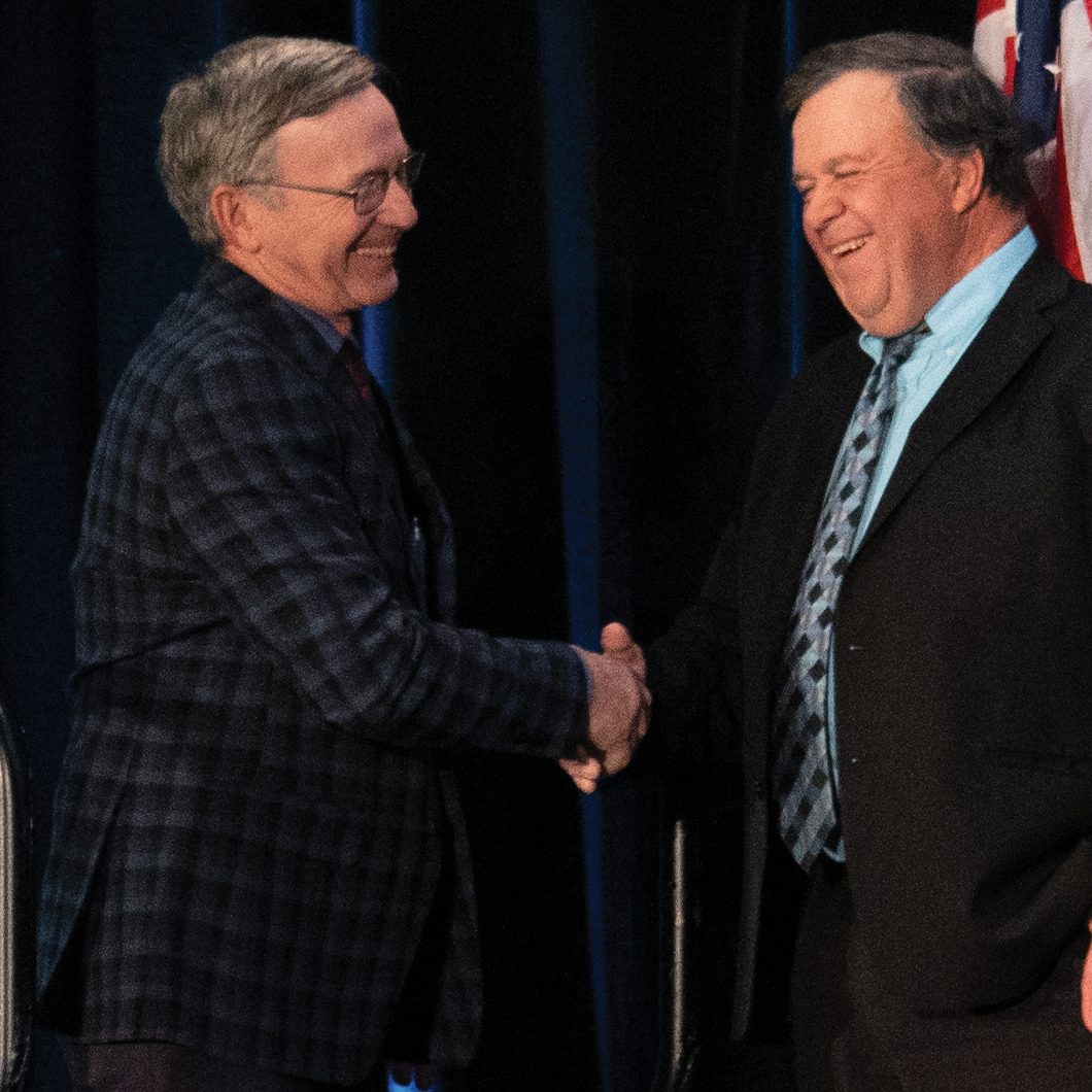 Dr. Richard Leeper, left, was recognized at the Indiana Electric Cooperatives’ Annual Meeting in December for his service to the cooperative. Leeper has served on the Marshall County REMC board of directors for 25 years. Outgoing Indiana Electric Cooperatives President Walter Hunter, right, congratulates Leeper on his achievement.