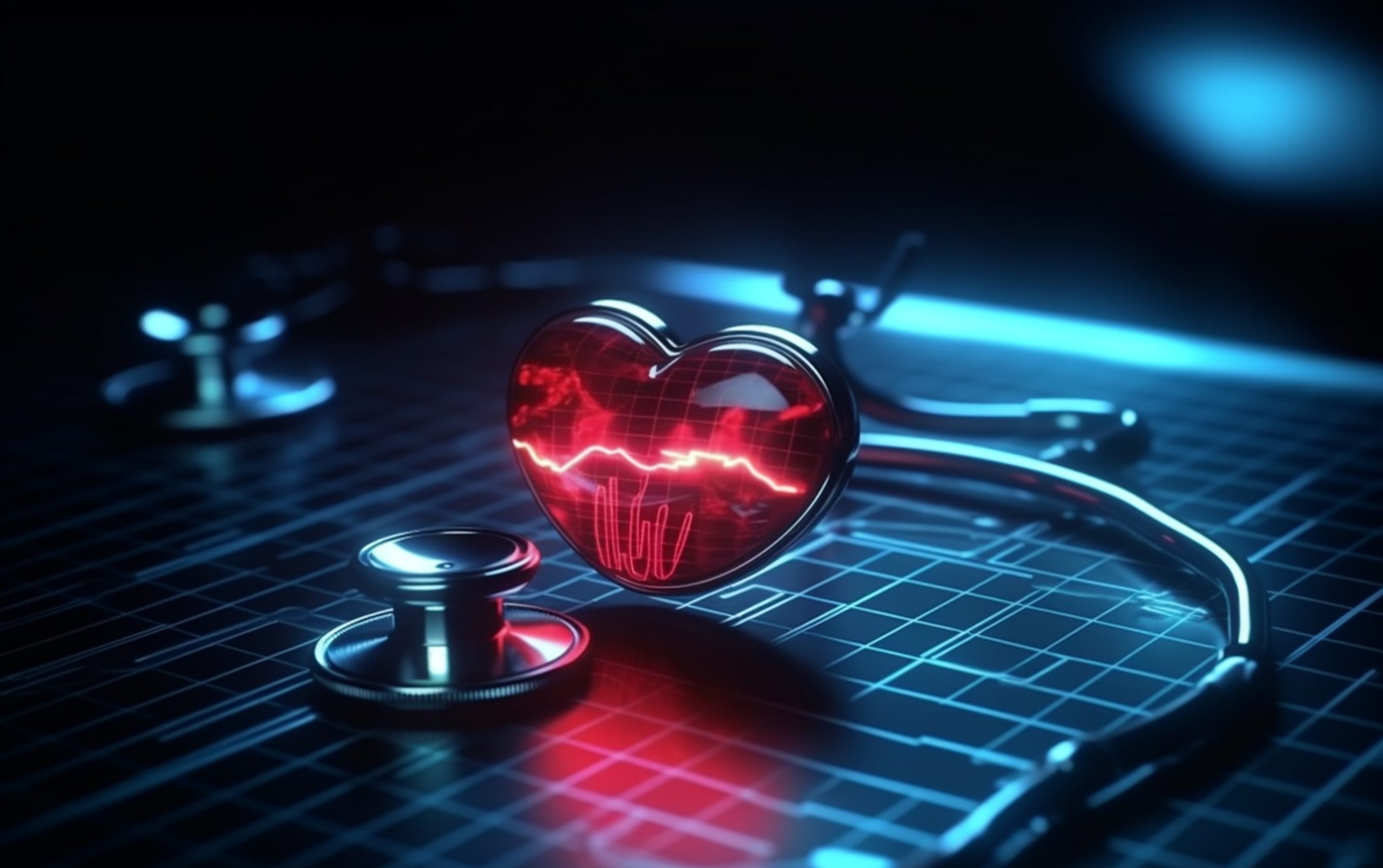 stethoscope and red heart with cardiogram. Neon Light effect. on black background. Generative AI