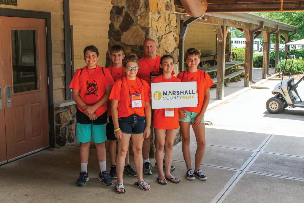 Students enjoyed rock climbing, swimming, horseback riding, bucket truck rides and much more. In addition, students learned about the role of electric cooperatives and renewable energy. Shown at right from left, Esaias Lemler; Travis Barnhart; Madison VanHulle; Todd Brems, operations manager and camp chaperone; Gillian Ousnamer; and Kaydence Howard represented Marshall County REMC at Touchstone Energy Camp.
